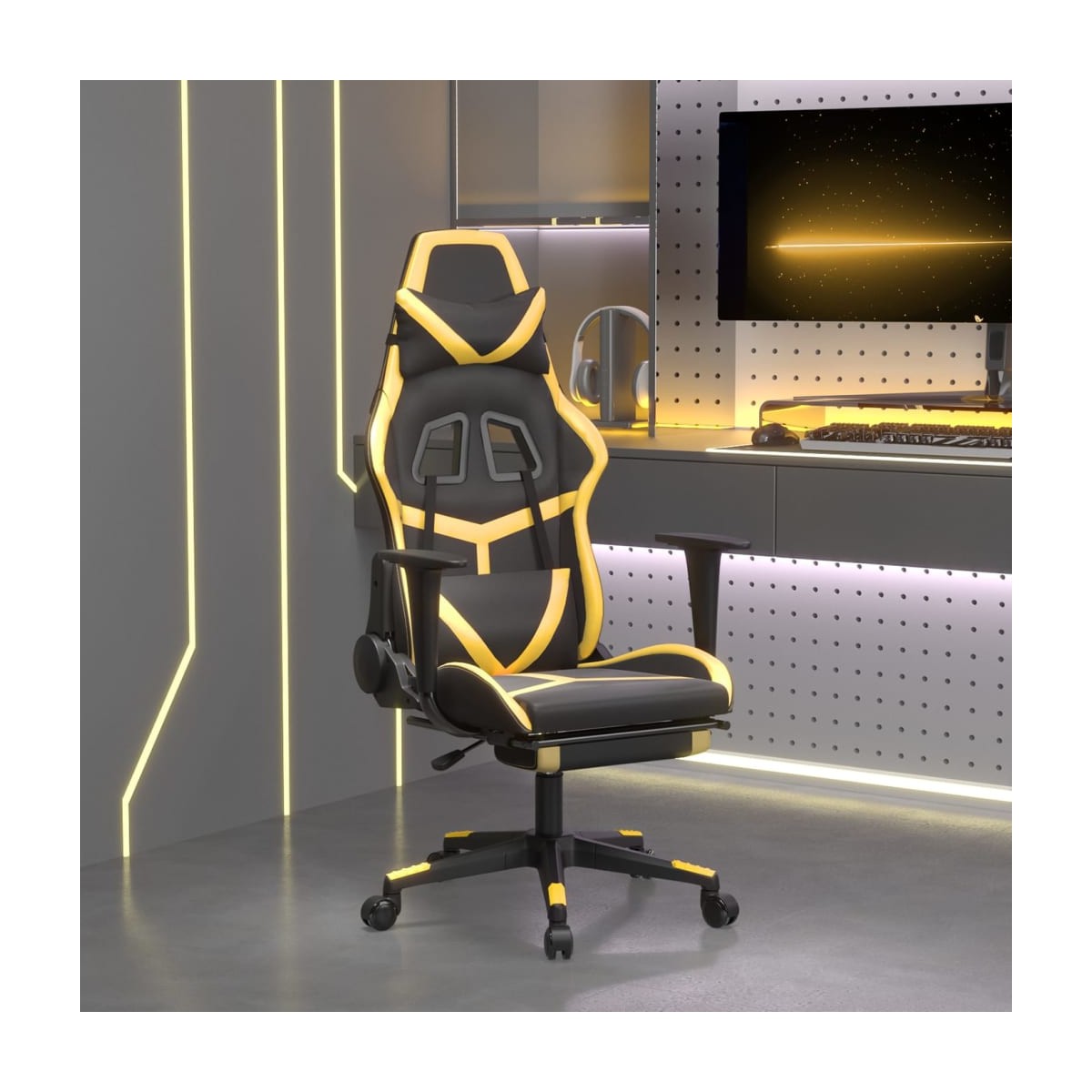 ¡Disfruta sentado en esta exclusiva silla gaming y mejora tu experiencia de juego con comodidad! Material duradero: El cuero sintético de primera calidad es un material muy duradero. Es resistente a las manchas, por lo que es fácil de limpiar con un paño húmedo. Además, la superficie lisa da un aspecto lujoso y la belleza del cuero auténtico.Respaldo y altura regulables: Está especialmente diseñado con una función reclinable para que puedas ajustar el respaldo y el reposapiés según prefieras. Utiliza la palanca para ajustar la altura del asiento a tu gusto.Diseño práctico: El diseño giratorio de 360 grados permite un amplio rango de movimientos. Además, resulta práctica de mover gracias a las ruedecitas.Estructura robusta y estable: Las estructuras de metal y madera contrachapada garantizan su solidez y estabilidad. Nota:Cada producto viene con un manual de montaje en la caja para facilitar el montaje.