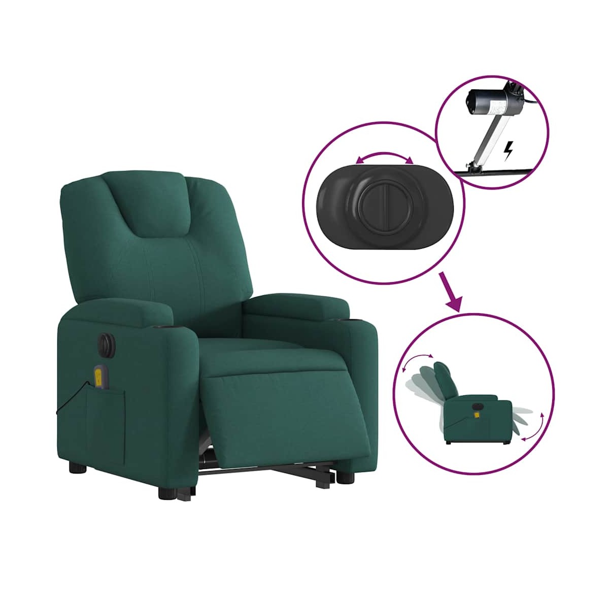 ¡Siéntate y déjate llevar en este cómodo sillón reclinable eléctrico! Función de elevación eléctrica: Este sillón reclinable para las personas mayores está equipado con un motor eléctrico para la función de elevación. Gracias a la función de elevación que empuja el sillón hacia arriba por completo, te puedes levantar fácilmente, sin tensiones en la espalda y las rodillas, con sólo pulsar el botón.Función reclinable eléctrica: Este sillón reclinable también está equipado con un motor eléctrico que ayuda a ajustar automáticamente el reposapiés y el respaldo a cualquier posición según tu comodidad con solo presionar el botón en el lateral del sillón. Esta característica permite una inclinación máxima de 135 grados. Además, el respaldo puede volver automáticamente a su lugar original con solo presionar un botón.Función de vibración: Los 6 puntos de masaje te harán disfrutar de un masaje mejor enfocado. Además, el mando incluido te permite elegir diferentes programas de masaje. La función de masaje funciona a través del conector USB que requiere una fuente de alimentación USB de 5 V certificada (no incluida).Cómodo asiento: El mullido asiento , el respaldo y los amplios reposabrazos cubiertos de tela proporcionan una sensación cómoda y acogedora, para que estés de maravilla mientras estás sentado. La tela posee un aspecto sencillo y limpio, y es transpirable y duradera.Prácticos portavasos y bolsillo lateral: Este sillón cuenta con dos cómodos portavasos para las bebidas y un bolsillo lateral para que tengas tus cosas al alcance de la mano.Estructura maciza y estable: La estructura, hecha de madera y metal, proporciona una estructura y una estabilidad fuertes. Este sillón reclinables es cómodo y duradero.