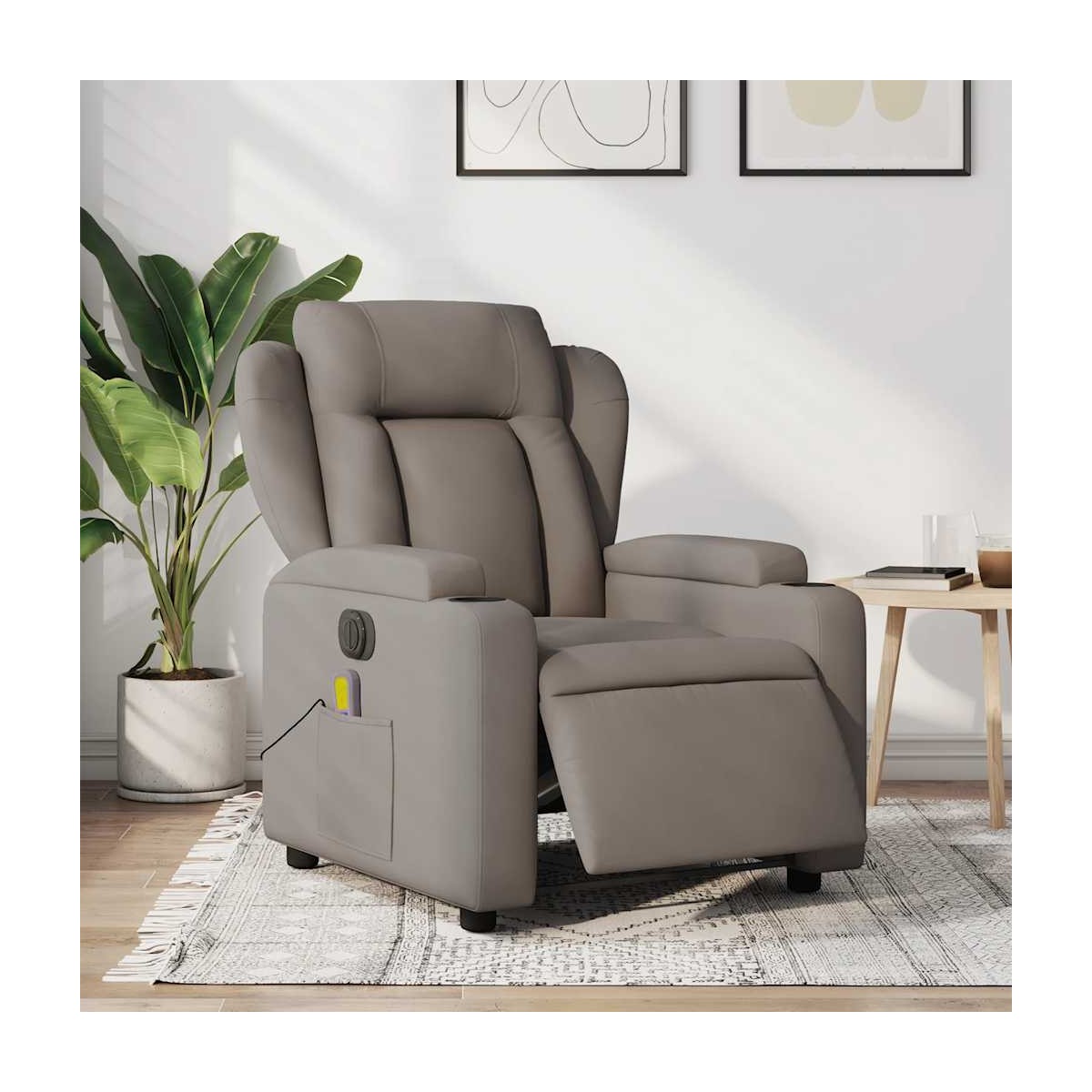 ¡Siéntate y descansa en este comodísimo sillón reclinable de masaje eléctrico! Función de reclinación eléctrica: Este sillón reclinable está equipado con un motor eléctrico para ajustar el reposapiés y el respaldo de forma automática a cualquier posición que desees con sólo pulsar el botón en el lateral del sillón. Esta característica permite una inclinación máxima de 135 grados. Además, el respaldo vuelve automáticamente a la posición original con sólo pulsar el botón.Función de vibración: Los 6 puntos de masaje te harán disfrutar de un masaje mejor enfocado. Además, el mando incluido te permite elegir diferentes programas de masaje. La función de masaje funciona a través del conector USB que requiere una fuente de alimentación USB de 5 V certificada (no incluida).Cómodo asiento: El mullido asiento , el respaldo y los amplios reposabrazos cubiertos de tela proporcionan una sensación cómoda y acogedora, para que estés de maravilla mientras estás sentado. La tela posee un aspecto sencillo y limpio, y es transpirable y duradera.Prácticos portavasos y bolsillo lateral: Este sillón cuenta con dos cómodos portavasos para las bebidas y un bolsillo lateral para que tengas tus cosas al alcance de la mano.Estructura maciza y estable: La estructura, hecha de madera y metal, proporciona una estructura y una estabilidad fuertes. Este sillón reclinables es cómodo y duradero.