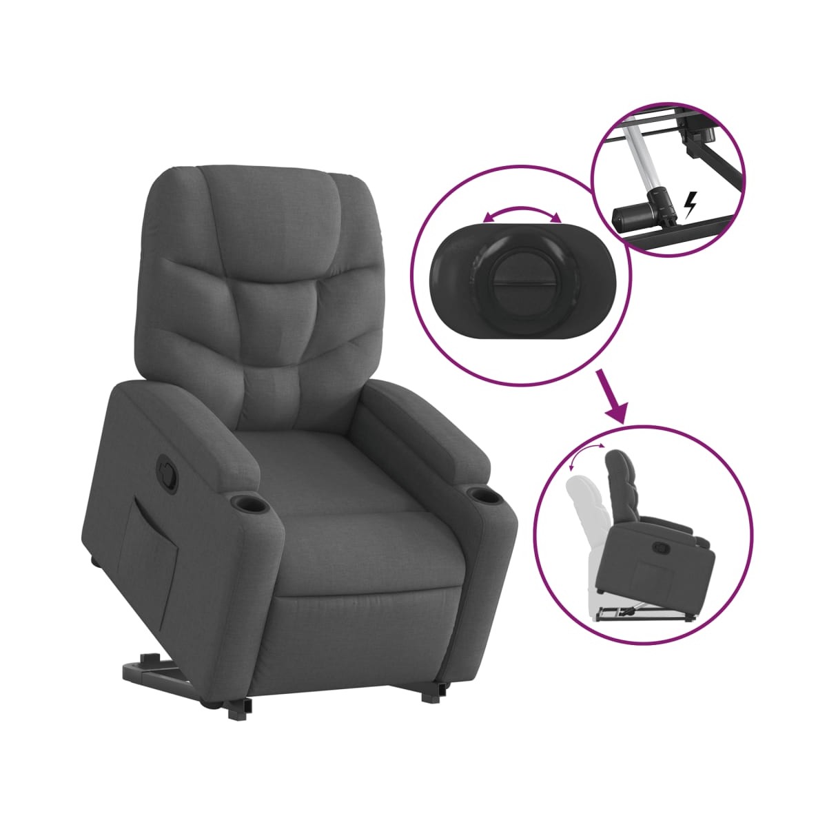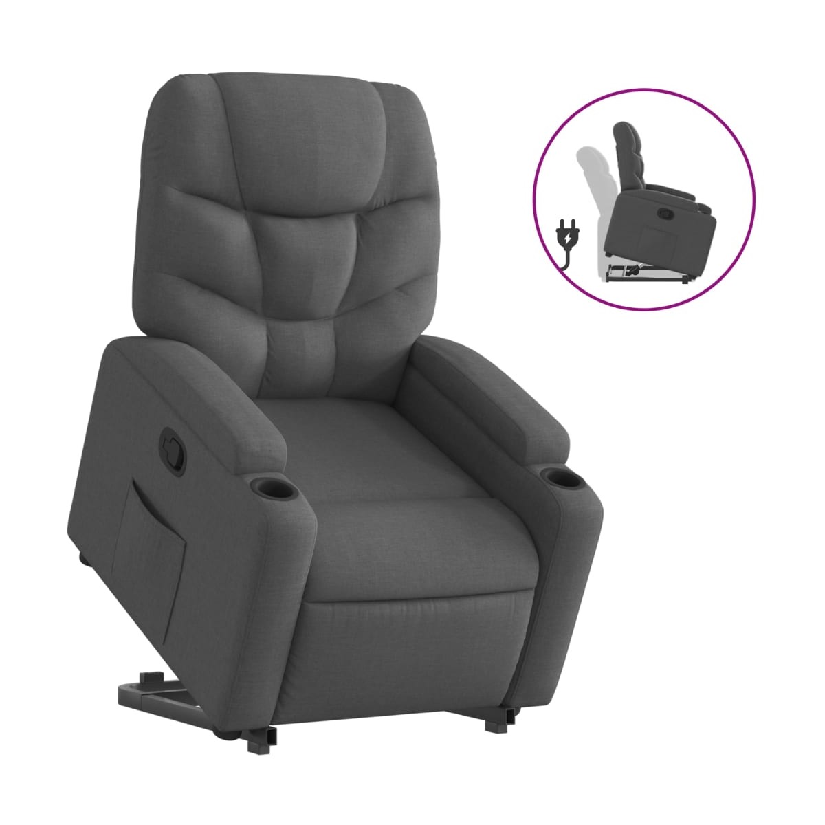 ¡Siéntate y descansa en este comodísimo sillón reclinable elevador! Función de elevación eléctrica: Este sillón reclinable para las personas mayores está equipado con un motor eléctrico para la función de elevación. Gracias a la función de elevación que empuja el sillón hacia arriba por completo, te puedes levantar fácilmente, sin tensiones en la espalda y las rodillas, con sólo pulsar el botón.Función de reclinado manual: Este sillón reclinable tiene un mango en el lado derecho. Con sólo tirar de él, puedes ajustar manualmente el reposapiés y el respaldo a cualquier posición que te resulte cómoda. Esta función permite una inclinación máxima de 135 grados. Además, el respaldo vuelve rápidamente a su posición original con solo tirar del mango.Cómodo asiento: El mullido asiento , el respaldo y los amplios reposabrazos cubiertos de tela proporcionan una sensación cómoda y acogedora, para que estés de maravilla mientras estás sentado. La tela posee un aspecto sencillo y limpio, y es transpirable y duradera.Prácticos portavasos y bolsillo lateral: Este sillón cuenta con dos cómodos portavasos para las bebidas y un bolsillo lateral para que guardes cosas al alcance de la mano.Estructura maciza y estable: La estructura, hecha de madera y metal, proporciona una estructura y una estabilidad fuertes. Este sillón reclinables es cómodo y duradero.