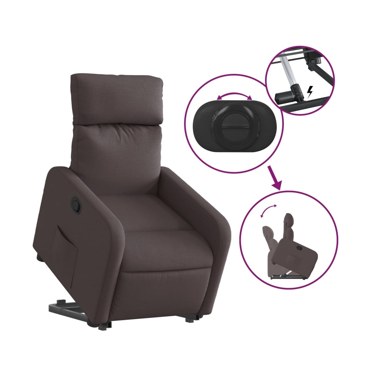 ¡Siéntate y descansa en este comodísimo sillón reclinable elevador! Función de elevación eléctrica: Este sillón reclinable para las personas mayores está equipado con un motor eléctrico para la función de elevación. Gracias a la función de elevación que empuja el sillón hacia arriba por completo, te puedes levantar fácilmente, sin tensiones en la espalda y las rodillas, con sólo pulsar el botón.Función de reclinado manual: Este sillón reclinable tiene un mango en el lado derecho. Con sólo tirar de él, puedes ajustar manualmente el reposapiés y el respaldo a cualquier posición que te resulte cómoda. Esta función permite una inclinación máxima de 135 grados. Además, el respaldo vuelve rápidamente a su posición original con solo tirar del mango.Cómodo asiento: El mullido asiento , el respaldo y los amplios reposabrazos cubiertos de tela proporcionan una sensación cómoda y acogedora, para que estés de maravilla mientras estás sentado. La tela posee un aspecto sencillo y limpio, y es transpirable y duradera.Práctico bolsillo lateral: Este sillón tiene un bolsillo lateral para que guardes tus cosas al alcance de la mano.Estructura maciza y estable: La estructura, hecha de madera y metal, proporciona una estructura y una estabilidad fuertes. Este sillón reclinables es cómodo y duradero.