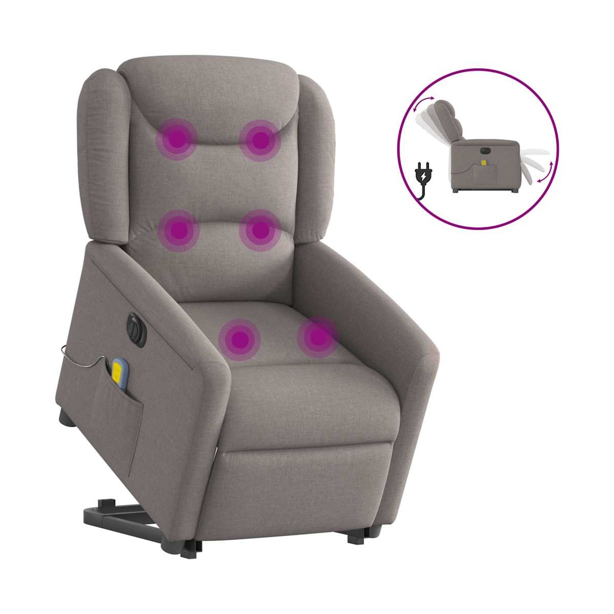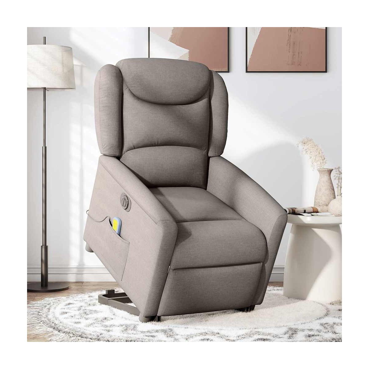 ¡Siéntate y déjate llevar en este cómodo sillón reclinable eléctrico! Función de elevación eléctrica: Este sillón reclinable para las personas mayores está equipado con un motor eléctrico para la función de elevación. Gracias a la función de elevación que empuja el sillón hacia arriba por completo, te puedes levantar fácilmente, sin tensiones en la espalda y las rodillas, con sólo pulsar el botón.Función reclinable eléctrica: Este sillón reclinable también está equipado con un motor eléctrico que ayuda a ajustar automáticamente el reposapiés y el respaldo a cualquier posición según tu comodidad con solo presionar el botón en el lateral del sillón. Esta característica permite una inclinación máxima de 135 grados. Además, el respaldo vuelve automáticamente al lugar original con solo presionar el botón.Función de vibración: Los 6 puntos de masaje te harán disfrutar de un masaje mejor enfocado. Además, el mando incluido te permite elegir diferentes programas de masaje. La función de masaje funciona a través del conector USB que requiere una fuente de alimentación USB de 5 V certificada (no incluida).Cómodo asiento: El mullido asiento , el respaldo y los amplios reposabrazos cubiertos de tela proporcionan una sensación cómoda y acogedora, para que estés de maravilla mientras estás sentado. La tela posee un aspecto sencillo y limpio, y es transpirable y duradera.Prácticos portavasos y bolsillo lateral: Este sillón cuenta con dos cómodos portavasos para las bebidas y un bolsillo lateral para que tengas tus cosas al alcance de la mano.Estructura maciza y estable: La estructura, hecha de madera y metal, proporciona una estructura y una estabilidad fuertes. Este sillón reclinables es cómodo y duradero.