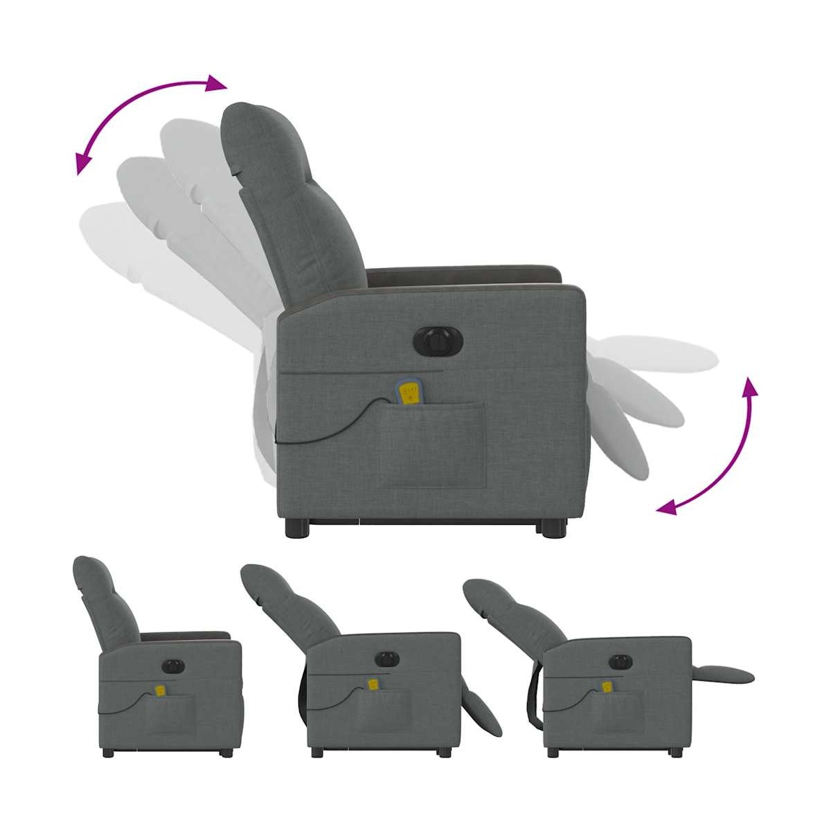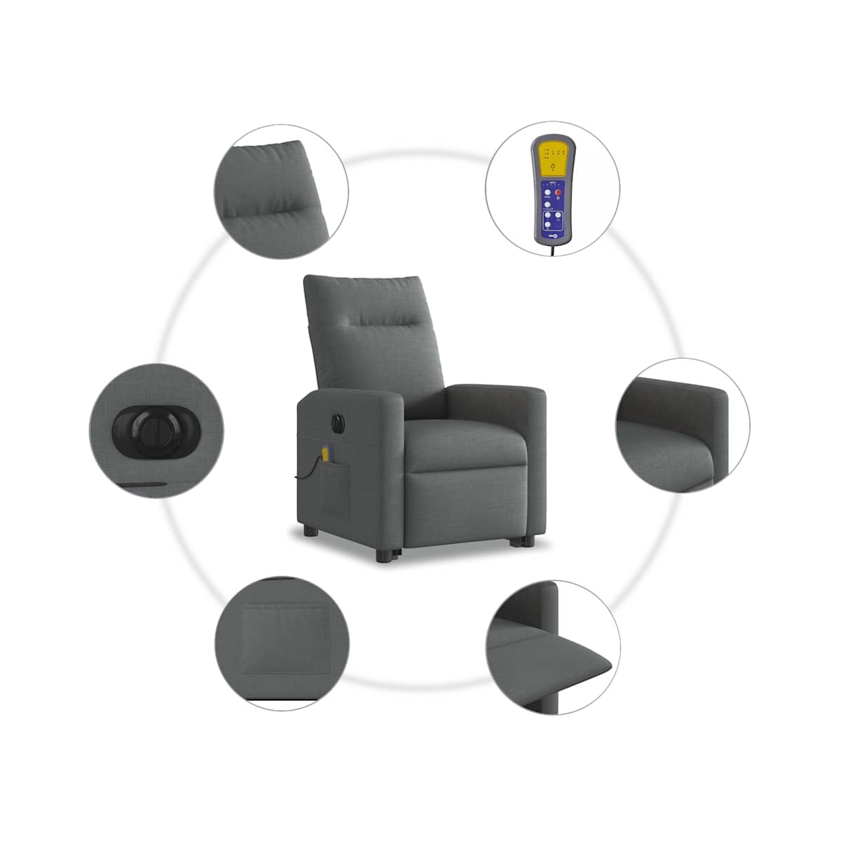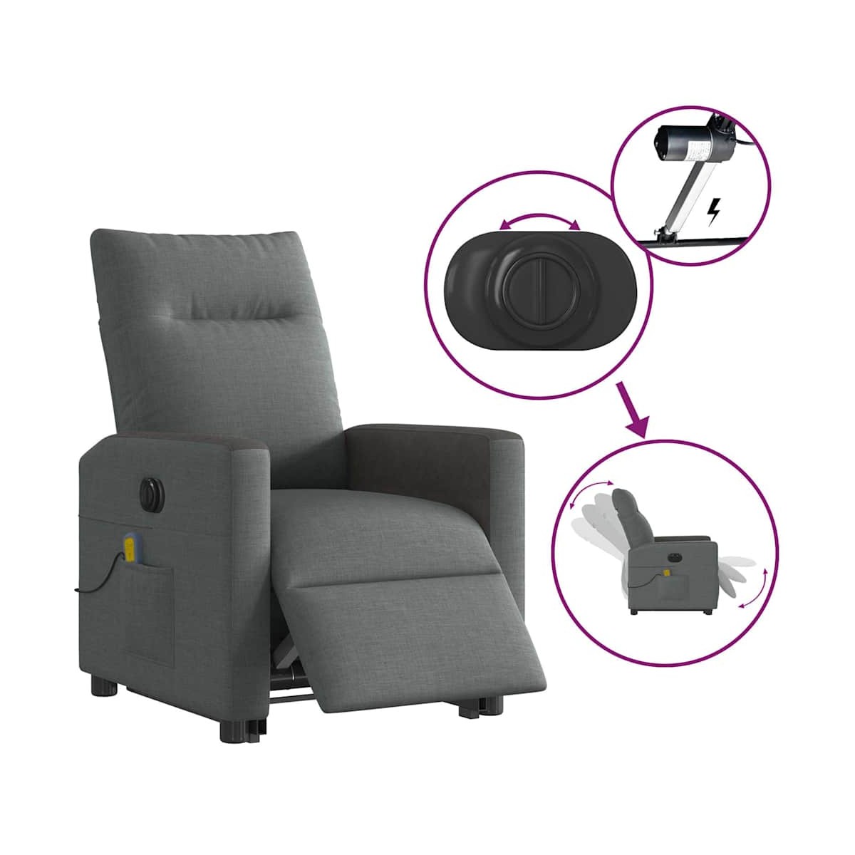 ¡Siéntate y déjate llevar en este cómodo sillón reclinable eléctrico! Función de elevación eléctrica: Este sillón reclinable para las personas mayores está equipado con un motor eléctrico para la función de elevación. Gracias a la función de elevación que empuja el sillón hacia arriba por completo, te puedes levantar fácilmente, sin tensiones en la espalda y las rodillas, con sólo pulsar el botón.Función reclinable eléctrica: Este sillón reclinable también está equipado con un motor eléctrico que ayuda a ajustar automáticamente el reposapiés y el respaldo a cualquier posición según tu comodidad con solo presionar el botón en el lateral del sillón. Esta característica permite una inclinación máxima de 135 grados. Además, el respaldo vuelve automáticamente al lugar original con solo presionar el botón.Función de vibración: Los 6 puntos de masaje te harán disfrutar de un masaje mejor enfocado. Además, el mando incluido te permite elegir diferentes programas de masaje. La función de masaje funciona a través del conector USB que requiere una fuente de alimentación USB de 5 V certificada (no incluida).Cómodo asiento: El mullido asiento , el respaldo y los amplios reposabrazos cubiertos de tela proporcionan una sensación cómoda y acogedora, para que estés de maravilla mientras estás sentado. La tela posee un aspecto sencillo y limpio, y es transpirable y duradera.Práctico bolsillo lateral: Este sillón tiene un bolsillo lateral para que guardes tus cosas al alcance de la mano.Estructura maciza y estable: La estructura, hecha de madera y metal, proporciona una estructura y una estabilidad fuertes. Este sillón reclinables es cómodo y duradero.