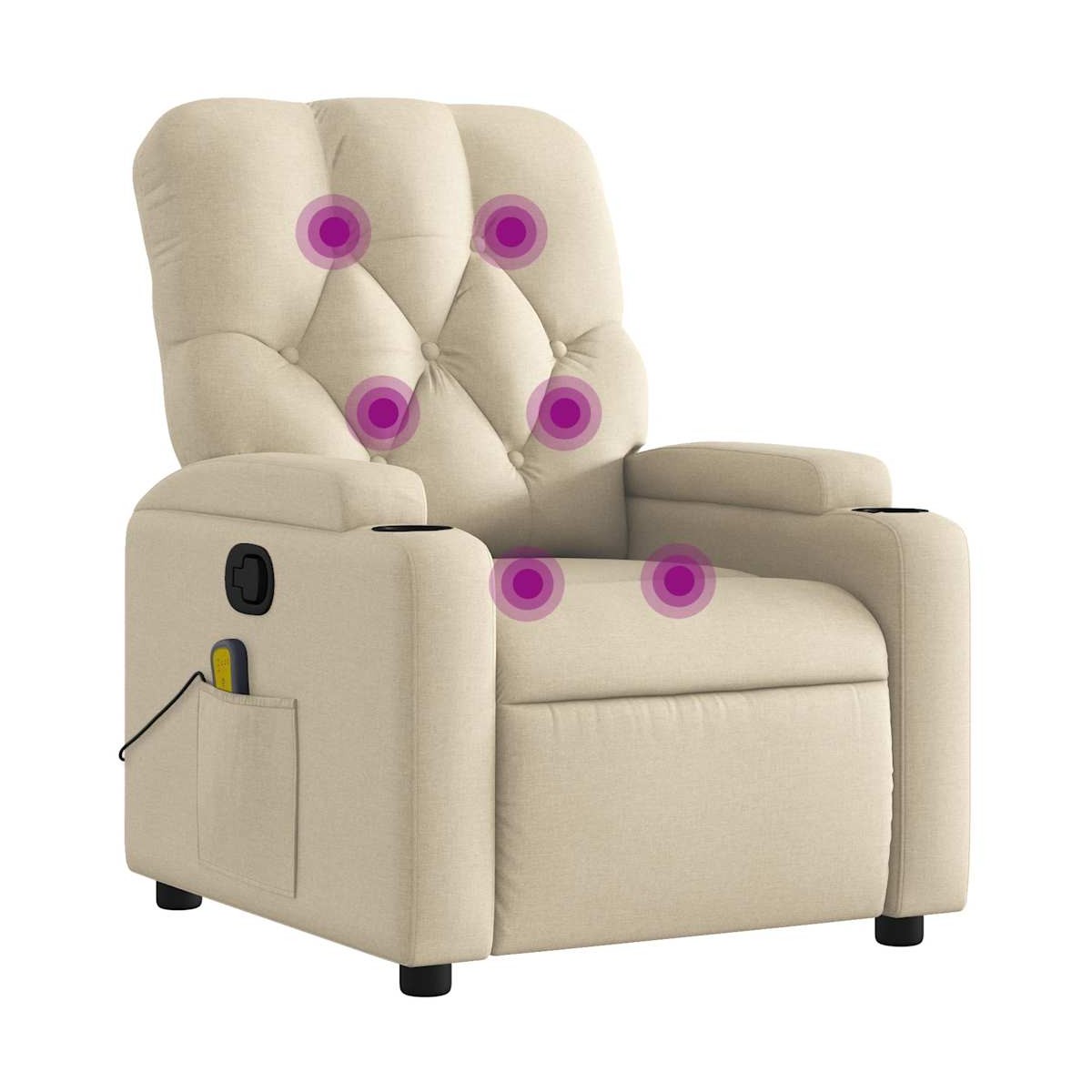 ¡Siéntate y descansa en este comodísimo sillón reclinable de masaje! Función de reclinado manual: Este sillón reclinable tiene un mango en el lado derecho. Con sólo tirar de él, puedes ajustar manualmente el reposapiés y el respaldo a cualquier posición que te resulte cómoda. Esta función permite una inclinación máxima de 135 grados. Además, el respaldo vuelve rápidamente a su posición original con solo tirar del mango.Función de vibración: Los 6 puntos de masaje te permiten disfrutar de un masaje mejor enfocado. Además, el mando incluido te permite elegir diferentes programas de masaje. La función de masaje funciona con el conector USB, pero no se incluye la fuente de alimentación USB de 5 V certificada.Cómodo asiento: El mullido asiento , el respaldo y los amplios reposabrazos cubiertos de tela proporcionan una sensación cómoda y acogedora, para que estés de maravilla mientras estás sentado. La tela posee un aspecto sencillo y limpio, y es transpirable y duradera.Prácticos portavasos y bolsillo lateral: Este sillón cuenta con dos cómodos portavasos para las bebidas y un bolsillo lateral para que tengas tus cosas al alcance de la mano.Estructura maciza y estable: La estructura, hecha de madera y metal, proporciona una estructura y una estabilidad fuertes. Este sillón reclinables es cómodo y duradero.