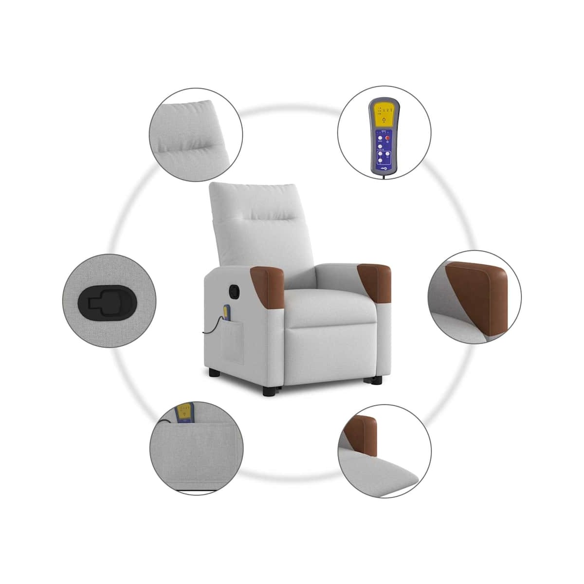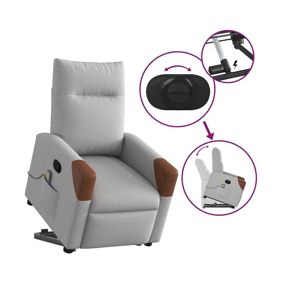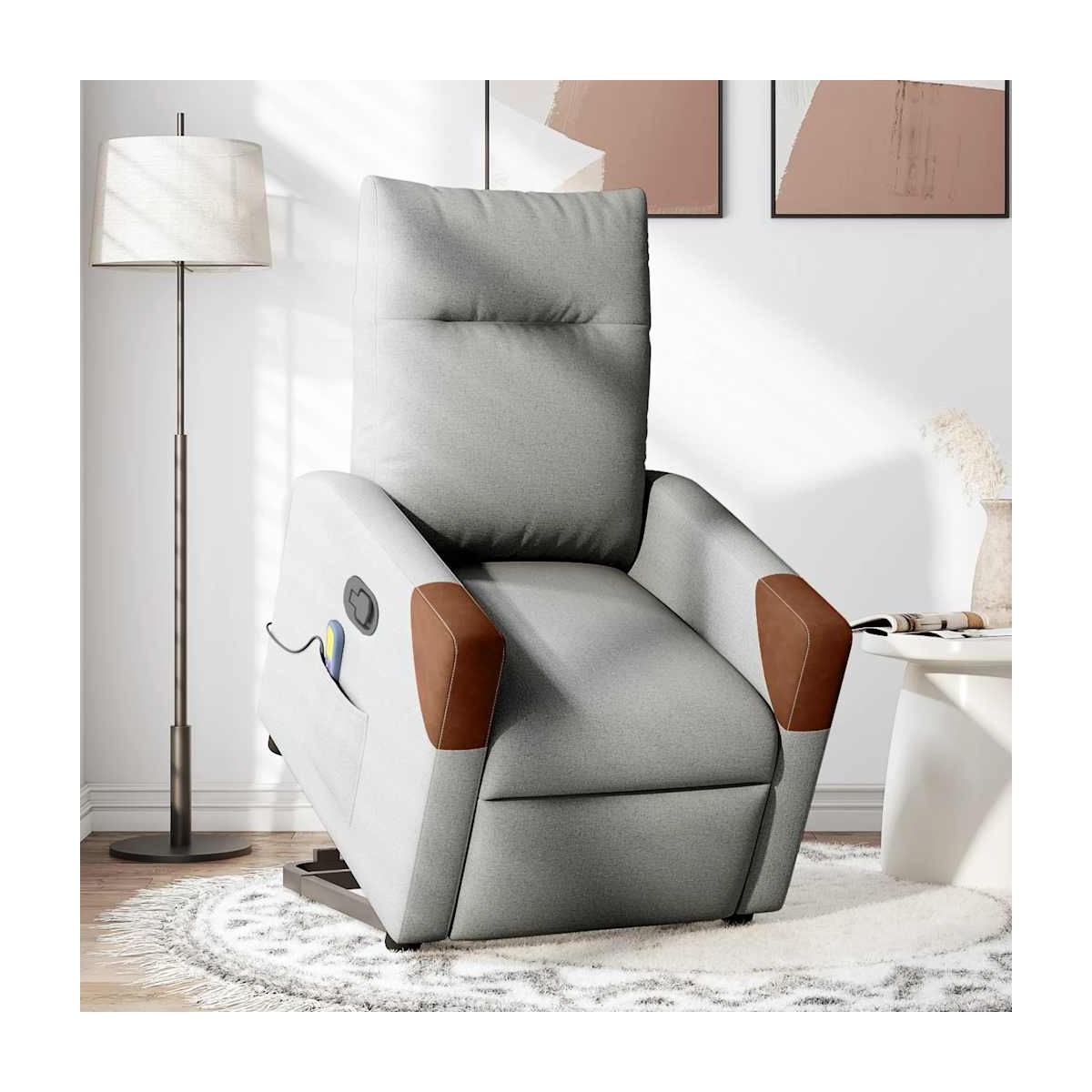 ¡Siéntate y descansa en este comodísimo sillón reclinable de masaje elevable! Función de elevación eléctrica: Este sillón reclinable para las personas mayores está equipado con un motor eléctrico para la función de elevación. Gracias a la función de elevación que empuja el sillón hacia arriba por completo, te puedes levantar fácilmente, sin tensiones en la espalda y las rodillas, con sólo pulsar el botón.Función de reclinado manual: Este sillón reclinable tiene un mango en el lado derecho. Con sólo tirar de él, puedes ajustar manualmente el reposapiés y el respaldo a cualquier posición que te resulte cómoda. Esta función permite una inclinación máxima de 135 grados. Además, el respaldo vuelve rápidamente a su posición original con solo tirar del mango.Función de vibración: Los 6 puntos de masaje te harán disfrutar de un masaje mejor enfocado. Además, el mando incluido te permite elegir diferentes programas de masaje. La función de masaje funciona a través del conector USB que requiere una fuente de alimentación USB de 5 V certificada (no incluida).Cómodo asiento: El mullido asiento , el respaldo y los amplios reposabrazos cubiertos de tela proporcionan una sensación cómoda y acogedora, para que estés de maravilla mientras estás sentado. La tela posee un aspecto sencillo y limpio, y es transpirable y duradera.Práctico bolsillo lateral: Este sillón tiene un bolsillo lateral para que guardes tus cosas al alcance de la mano.Estructura maciza y estable: La estructura, hecha de madera y metal, proporciona una estructura y una estabilidad fuertes. Este sillón reclinables es cómodo y duradero.