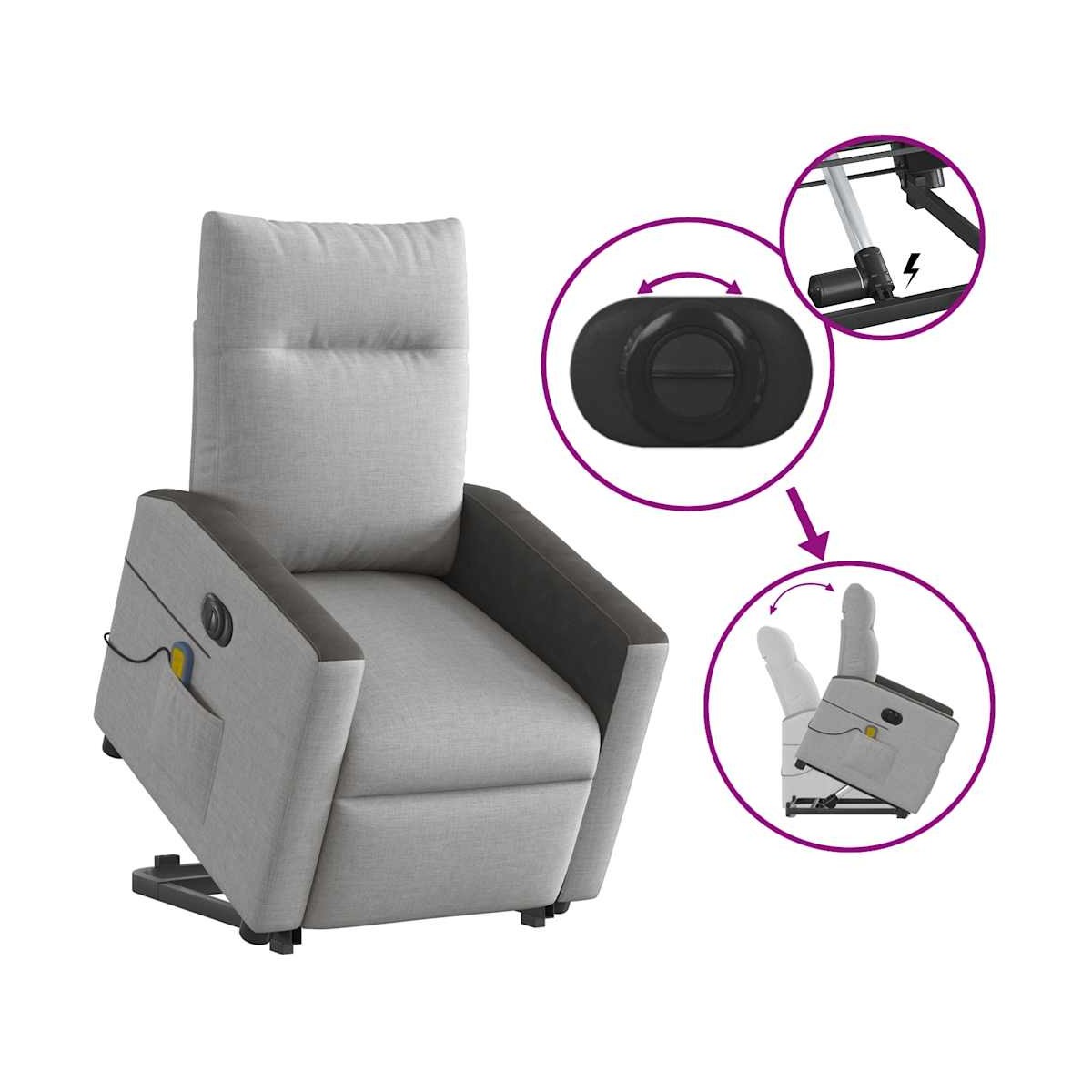¡Siéntate y déjate llevar en este cómodo sillón reclinable eléctrico! Función de elevación eléctrica: Este sillón reclinable para las personas mayores está equipado con un motor eléctrico para la función de elevación. Gracias a la función de elevación que empuja el sillón hacia arriba por completo, te puedes levantar fácilmente, sin tensiones en la espalda y las rodillas, con sólo pulsar el botón.Función reclinable eléctrica: Este sillón reclinable también está equipado con un motor eléctrico que ayuda a ajustar automáticamente el reposapiés y el respaldo a cualquier posición según tu comodidad con solo presionar el botón en el lateral del sillón. Esta característica permite una inclinación máxima de 135 grados. Además, el respaldo vuelve automáticamente al lugar original con solo presionar el botón.Función de vibración: Los 6 puntos de masaje te harán disfrutar de un masaje mejor enfocado. Además, el mando incluido te permite elegir diferentes programas de masaje. La función de masaje funciona a través del conector USB que requiere una fuente de alimentación USB de 5 V certificada (no incluida).Cómodo asiento: El mullido asiento , el respaldo y los amplios reposabrazos cubiertos de tela proporcionan una sensación cómoda y acogedora, para que estés de maravilla mientras estás sentado. La tela posee un aspecto sencillo y limpio, y es transpirable y duradera.Práctico bolsillo lateral: Este sillón tiene un bolsillo lateral para que guardes tus cosas al alcance de la mano.Estructura maciza y estable: La estructura, hecha de madera y metal, proporciona una estructura y una estabilidad fuertes. Este sillón reclinables es cómodo y duradero.