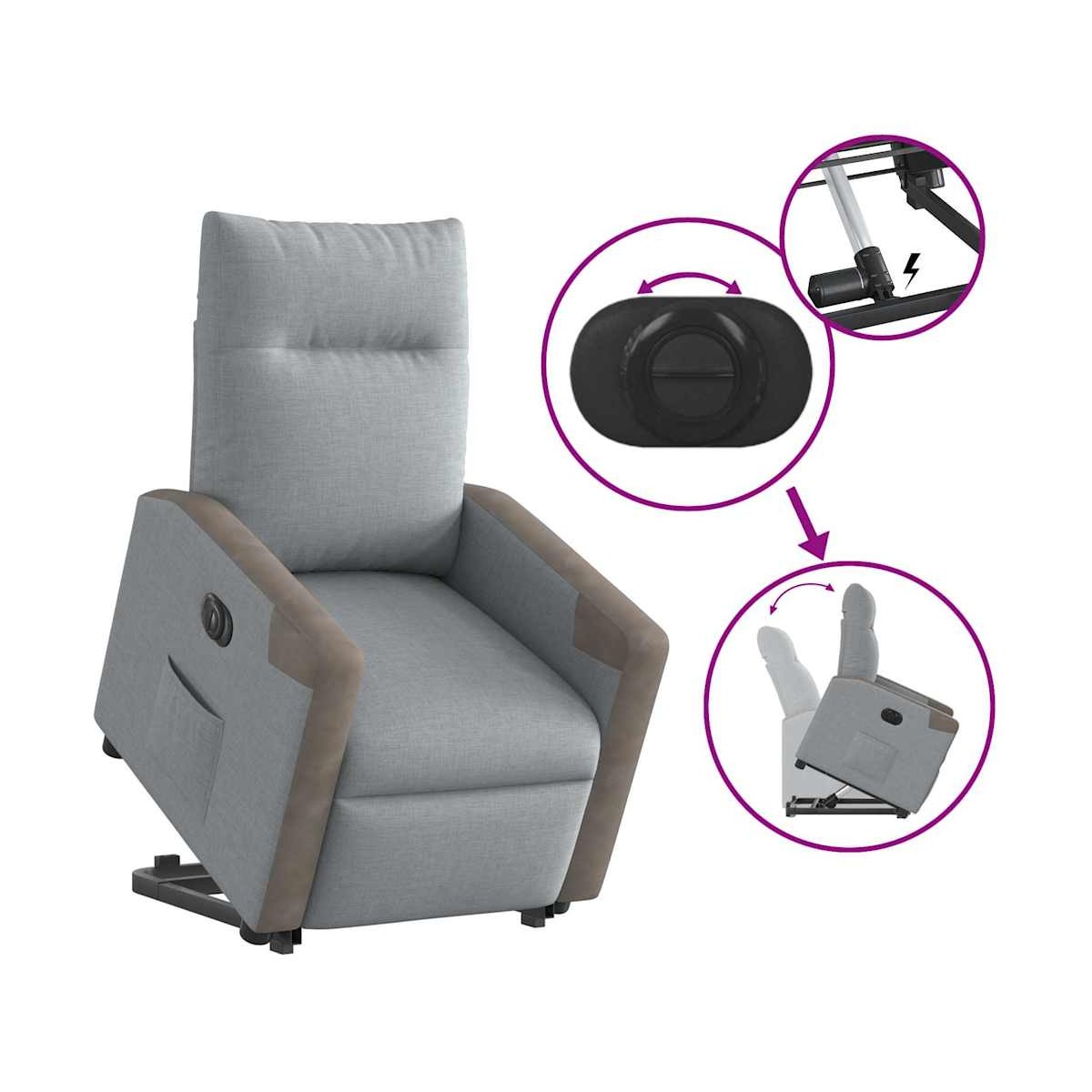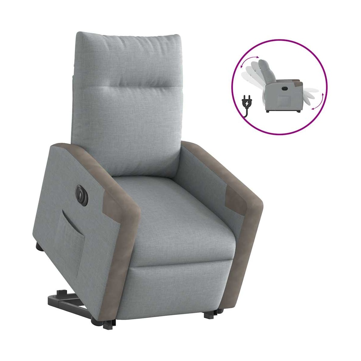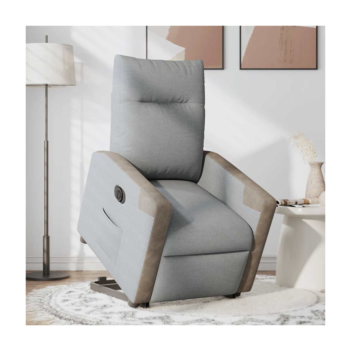 ¡Siéntate y déjate llevar en este comodísimo sillón reclinable y elevable eléctrico! Función de elevación eléctrica: Este sillón reclinable para las personas mayores está equipado con un motor eléctrico para la función de elevación. Gracias a la función de elevación que empuja el sillón hacia arriba por completo, te puedes levantar fácilmente, sin tensiones en la espalda y las rodillas, con sólo pulsar el botón.Función reclinable eléctrica: Este sillón reclinable también está equipado con un motor eléctrico que ayuda a ajustar el reposapiés y el respaldo de forma automática a cualquier posición que desees con solo presionar el botón en el lateral del sillón. Esta característica permite una inclinación máxima de 135 grados. Además, el respaldo vuelve automáticamente al lugar original con solo presionar el botón.Cómodo asiento: El mullido asiento, el respaldo y los amplios reposabrazos cubiertos de tela proporcionan una sensación cómoda y acogedora, para que estés de maravilla mientras estás sentado. La tela posee un aspecto sencillo y limpio, y es transpirable y duradera.Práctico bolsillo lateral: Este sillón tiene un bolsillo lateral para que guardes tus cosas al alcance de la mano.Estructura maciza y estable: La estructura, hecha de madera y metal, proporciona una estructura y una estabilidad fuertes. Este sillón reclinables es cómodo y duradero.