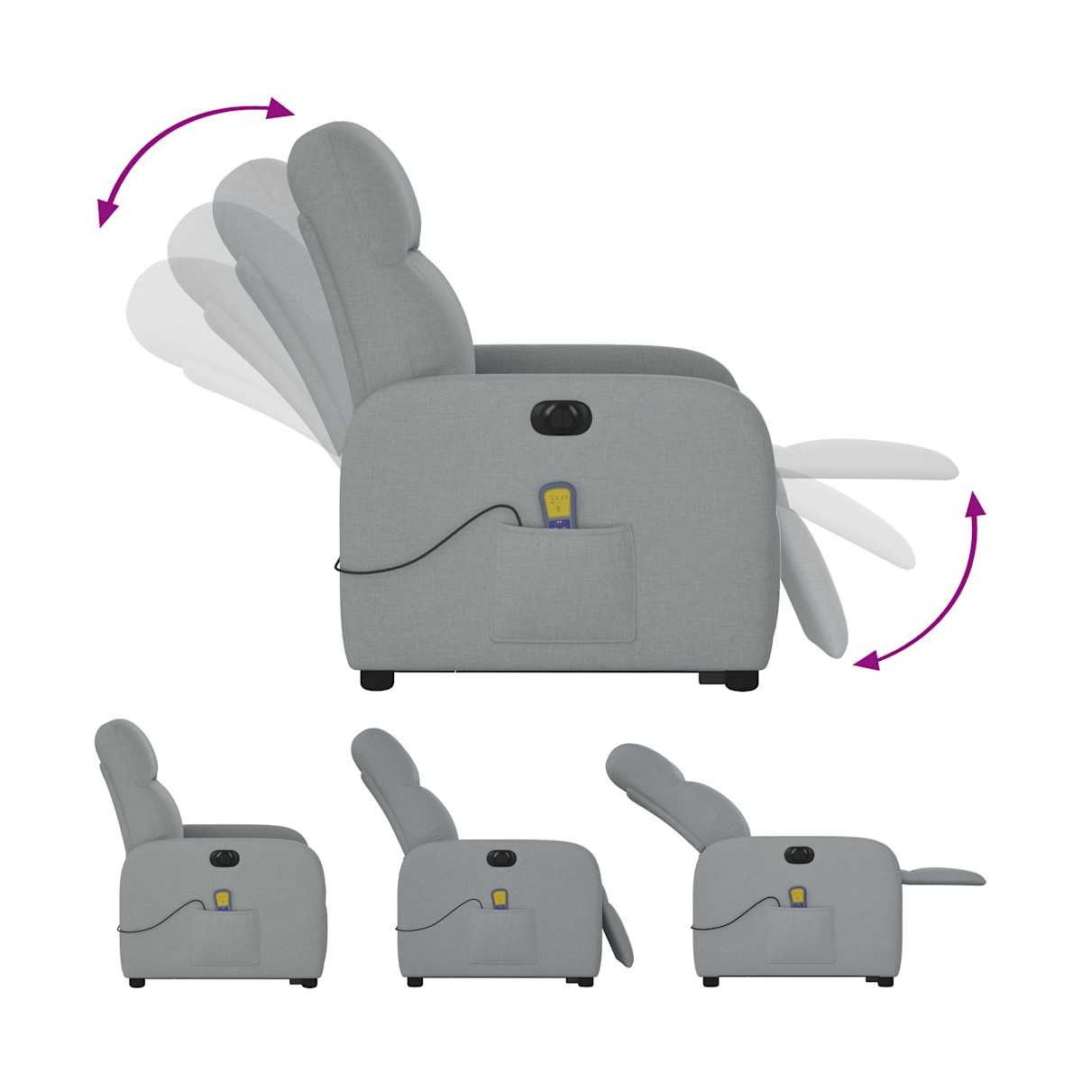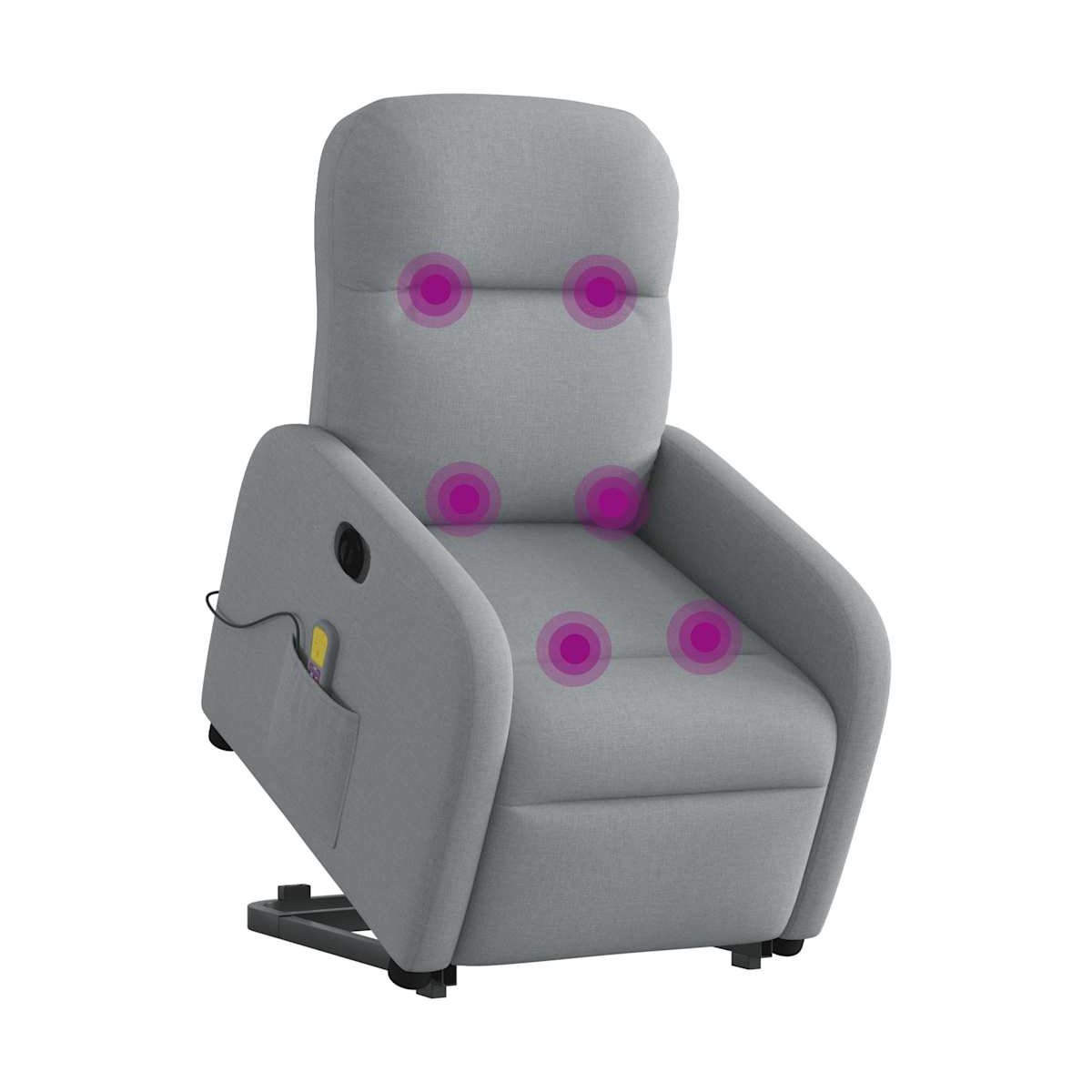 ¡Siéntate y déjate llevar en este cómodo sillón reclinable eléctrico! Función de elevación eléctrica: Este sillón reclinable para las personas mayores está equipado con un motor eléctrico para la función de elevación. Gracias a la función de elevación que empuja el sillón hacia arriba por completo, te puedes levantar fácilmente, sin tensiones en la espalda y las rodillas, con sólo pulsar el botón.Función reclinable eléctrica: Este sillón reclinable también está equipado con un motor eléctrico que ayuda a ajustar automáticamente el reposapiés y el respaldo a cualquier posición según tu comodidad con solo presionar el botón en el lateral del sillón. Esta característica permite una inclinación máxima de 135 grados. Además, el respaldo vuelve automáticamente al lugar original con solo presionar el botón.Función de vibración: Los 6 puntos de masaje te harán disfrutar de un masaje mejor enfocado. Además, el mando incluido te permite elegir diferentes programas de masaje. La función de masaje funciona a través del conector USB que requiere una fuente de alimentación USB de 5 V certificada (no incluida).Cómodo asiento: El mullido asiento , el respaldo y los amplios reposabrazos cubiertos de tela proporcionan una sensación cómoda y acogedora, para que estés de maravilla mientras estás sentado. La tela posee un aspecto sencillo y limpio, y es transpirable y duradera.Práctico bolsillo lateral: Este sillón cuenta con un bolsillo lateral para guardar el mando a distancia o mantener tus cosas al alcance de la mano.Estructura maciza y estable: La estructura, hecha de madera y metal, proporciona una estructura y una estabilidad fuertes. Este sillón reclinables es cómodo y duradero.