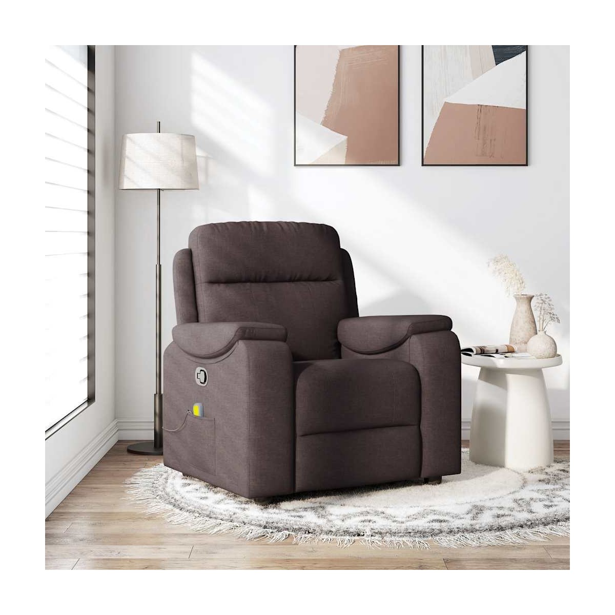 ¡Siéntate y descansa en este comodísimo sillón reclinable de masaje! Función de reclinado manual: Este sillón reclinable tiene un mango en el lado derecho. Con sólo tirar de él, puedes ajustar manualmente el reposapiés y el respaldo a cualquier posición que te resulte cómoda. Esta función permite una inclinación máxima de 135 grados. Además, el respaldo vuelve rápidamente a su posición original con solo tirar del mango.Función de masaje: Los 6 puntos de masaje te permiten experimentar un masaje mejor dirigido. Además, el mando incluido te permite elegir diferentes programas de masaje. La función de masaje funciona con el conector USB, pero no se incluye la fuente de alimentación USB de 5 V certificada.Cómodo asiento: El mullido asiento , el respaldo y los amplios reposabrazos cubiertos de tela proporcionan una sensación cómoda y acogedora, para que estés de maravilla mientras estás sentado. La tela posee un aspecto sencillo y limpio, y es transpirable y duradera.Práctico bolsillo lateral: Este sillón cuenta con un bolsillo lateral para guardar el mando a distancia o mantener tus cosas al alcance de la mano.Estructura maciza y estable: La estructura, hecha de madera y metal, proporciona una estructura y una estabilidad fuertes. Este sillón reclinables es cómodo y duradero.