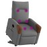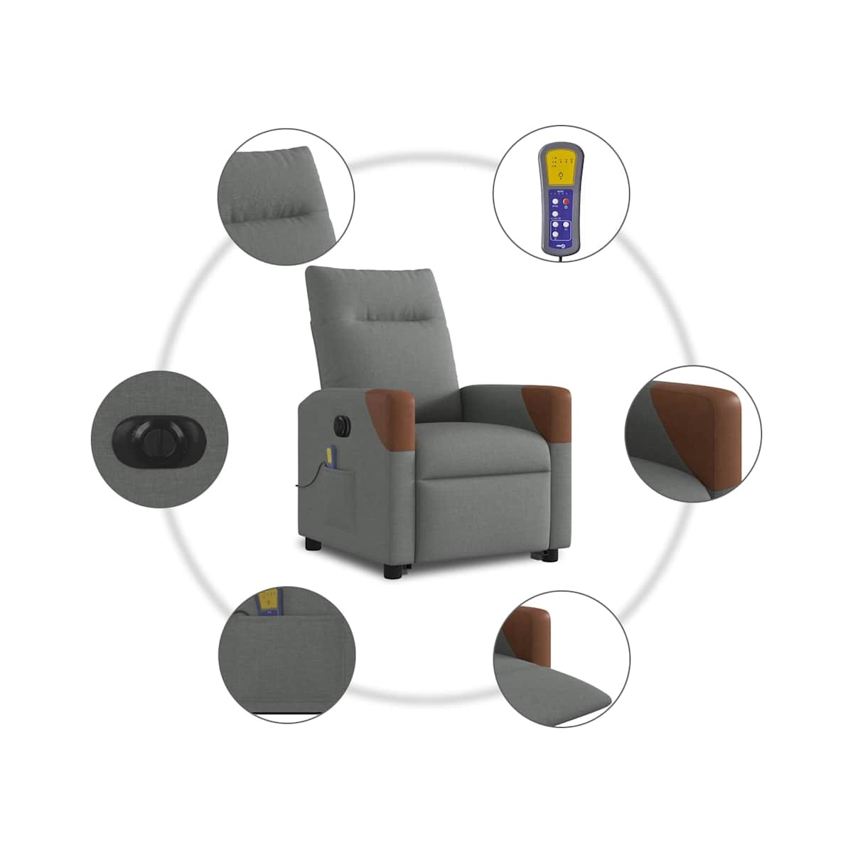 ¡Siéntate y déjate llevar en este cómodo sillón reclinable eléctrico! Función de elevación eléctrica: Este sillón reclinable para las personas mayores está equipado con un motor eléctrico para la función de elevación. Gracias a la función de elevación que empuja el sillón hacia arriba por completo, te puedes levantar fácilmente, sin tensiones en la espalda y las rodillas, con sólo pulsar el botón.Función reclinable eléctrica: Este sillón reclinable también está equipado con un motor eléctrico que ayuda a ajustar automáticamente el reposapiés y el respaldo a cualquier posición según tu comodidad con solo presionar el botón en el lateral del sillón. Esta característica permite una inclinación máxima de 135 grados. Además, el respaldo vuelve automáticamente al lugar original con solo presionar el botón.Función de vibración: Los 6 puntos de masaje te harán disfrutar de un masaje mejor enfocado. Además, el mando incluido te permite elegir diferentes programas de masaje. La función de masaje funciona a través del conector USB que requiere una fuente de alimentación USB de 5 V certificada (no incluida).Cómodo asiento: El mullido asiento , el respaldo y los amplios reposabrazos cubiertos de tela proporcionan una sensación cómoda y acogedora, para que estés de maravilla mientras estás sentado. La tela posee un aspecto sencillo y limpio, y es transpirable y duradera.Práctico bolsillo lateral: Este sillón tiene un bolsillo lateral para que guardes tus cosas al alcance de la mano.Estructura maciza y estable: La estructura, hecha de madera y metal, proporciona una estructura y una estabilidad fuertes. Este sillón reclinables es cómodo y duradero.