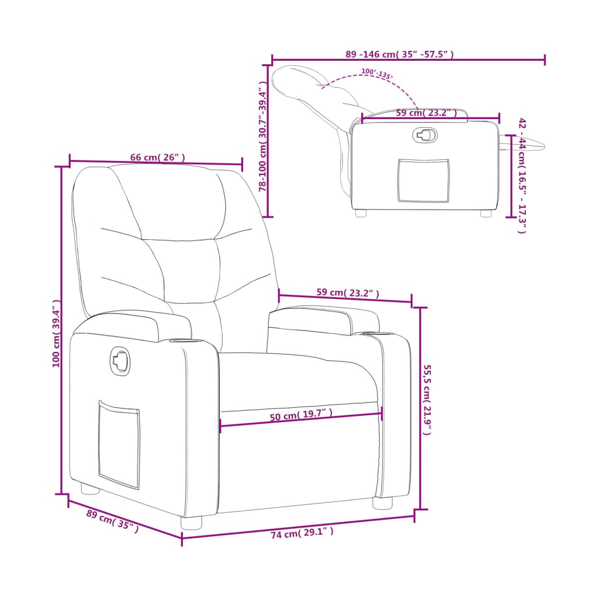 - Dimensiones sentado: 74 x 89 x 100 cm (ancho x profundo x alto)