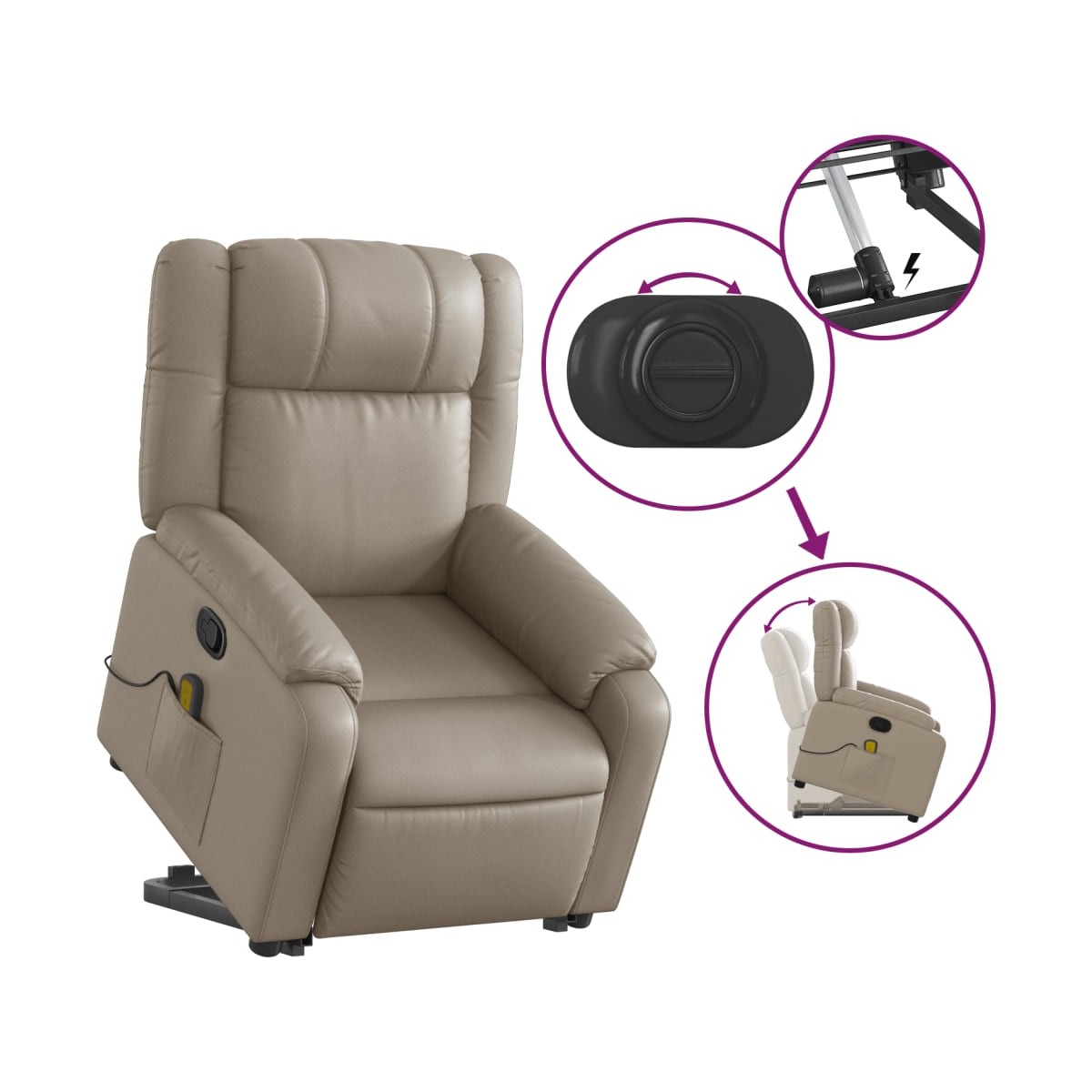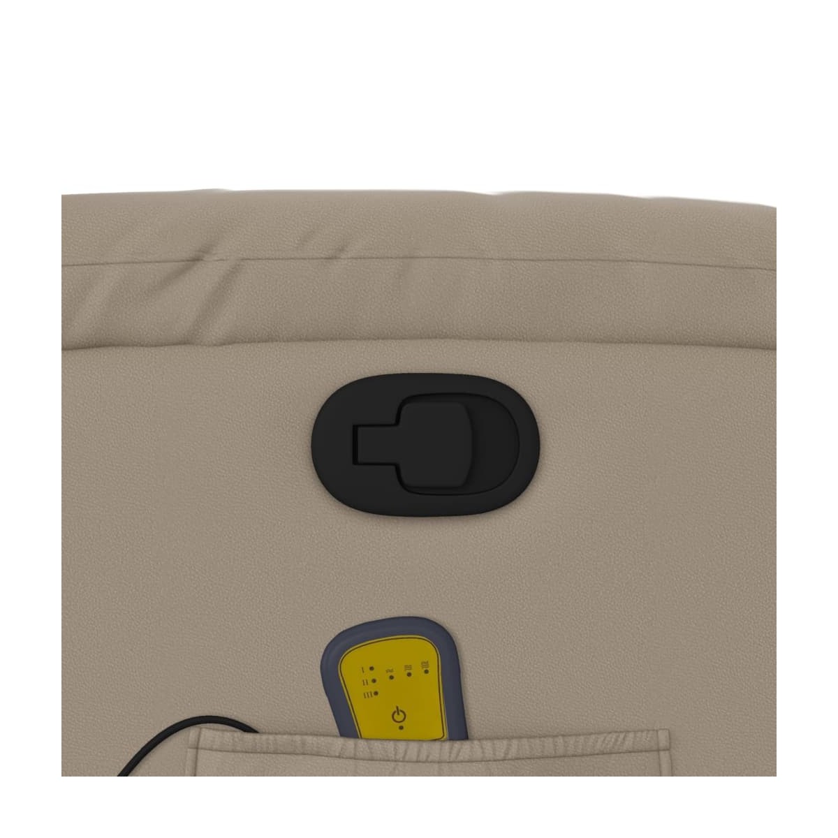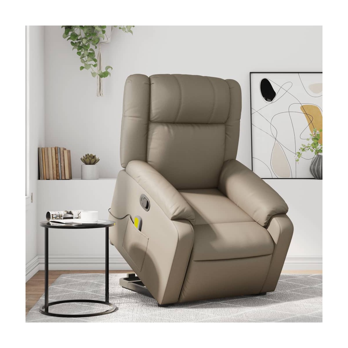 ¡Siéntate y descansa en este comodísimo sillón reclinable de masaje elevable! Función de elevación eléctrica: Este sillón reclinable para las personas mayores está equipado con un motor eléctrico para la función de elevación. Gracias a la función de elevación que empuja el sillón hacia arriba por completo, te puedes levantar fácilmente, sin tensiones en la espalda y las rodillas, con sólo pulsar el botón.Función de reclinado manual: Este sillón reclinable tiene un mango en el lado derecho. Con sólo tirar de él, puedes ajustar manualmente el reposapiés y el respaldo a cualquier posición que te resulte cómoda. Esta función permite una inclinación máxima de 135 grados. Además, el respaldo vuelve rápidamente a su posición original con solo tirar del mango.Función de vibración: Los 6 puntos de masaje te harán disfrutar de un masaje mejor enfocado. Además, el mando incluido te permite elegir diferentes programas de masaje. La función de masaje funciona a través del conector USB que requiere una fuente de alimentación USB de 5 V certificada (no incluida).Cómodo asiento: El grueso acolchado del asiento, el respaldo y los anchos reposabrazos recubiertos de cuero sintético proporcionan una sensación acogedora y cálida, como si te estuvieran abrazando. El cuero sintético es un material muy duradero y resistente a las manchas, por lo que resulta fácil de limpiar con un paño húmedo. Además, la superficie lisa le confiere un aspecto lujoso y la belleza de la piel auténtica.Práctico bolsillo lateral: Este sillón cuenta con un bolsillo lateral para guardar el mando a distancia o mantener tus cosas al alcance de la mano.Estructura maciza y estable: La estructura, hecha de madera y metal, proporciona una estructura y una estabilidad fuertes. Este sillón reclinables es cómodo y duradero.