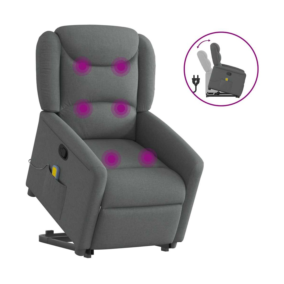 ¡Siéntate y descansa en este comodísimo sillón reclinable de masaje elevable! Función de elevación eléctrica: Este sillón reclinable para las personas mayores está equipado con un motor eléctrico para la función de elevación. Gracias a la función de elevación que empuja el sillón hacia arriba por completo, te puedes levantar fácilmente, sin tensiones en la espalda y las rodillas, con sólo pulsar el botón.Función de reclinado manual: Este sillón reclinable tiene un mango en el lado derecho. Con sólo tirar de él, puedes ajustar manualmente el reposapiés y el respaldo a cualquier posición que te resulte cómoda. Esta función permite una inclinación máxima de 135 grados. Además, el respaldo vuelve rápidamente a su posición original con solo tirar del mango.Función de vibración: Los 6 puntos de masaje te harán disfrutar de un masaje mejor enfocado. Además, el mando incluido te permite elegir diferentes programas de masaje. La función de masaje funciona a través del conector USB que requiere una fuente de alimentación USB de 5 V certificada (no incluida).Cómodo asiento: El mullido asiento , el respaldo y los amplios reposabrazos cubiertos de tela proporcionan una sensación cómoda y acogedora, para que estés de maravilla mientras estás sentado. La tela posee un aspecto sencillo y limpio, y es transpirable y duradera.Prácticos portavasos y bolsillo lateral: Este sillón cuenta con dos cómodos portavasos para las bebidas y un bolsillo lateral para que tengas tus cosas al alcance de la mano.Estructura maciza y estable: La estructura, hecha de madera y metal, proporciona una estructura y una estabilidad fuertes. Este sillón reclinables es cómodo y duradero.