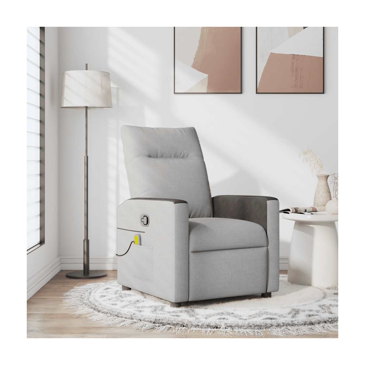 ¡Siéntate y descansa en este comodísimo sillón reclinable de masaje! Función de reclinado manual: Este sillón reclinable tiene un mango en el lado derecho. Con sólo tirar de él, puedes ajustar manualmente el reposapiés y el respaldo a cualquier posición que te resulte cómoda. Esta función permite una inclinación máxima de 135 grados. Además, el respaldo vuelve rápidamente a su posición original con solo tirar del mango.Función de vibración: Los 6 puntos de masaje te harán disfrutar de un masaje mejor enfocado. Además, el mando incluido te permite elegir diferentes programas de masaje. La función de masaje funciona a través del conector USB que requiere una fuente de alimentación USB de 5 V certificada (no incluida).Cómodo asiento: El mullido asiento , el respaldo y los amplios reposabrazos cubiertos de tela proporcionan una sensación cómoda y acogedora, para que estés de maravilla mientras estás sentado. La tela posee un aspecto sencillo y limpio, y es transpirable y duradera.Práctico bolsillo lateral: Este sillón cuenta con un bolsillo lateral para guardar el mando a distancia o mantener tus cosas al alcance de la mano.Estructura maciza y estable: La estructura, hecha de madera y metal, proporciona una estructura y una estabilidad fuertes. Este sillón reclinables es cómodo y duradero.
