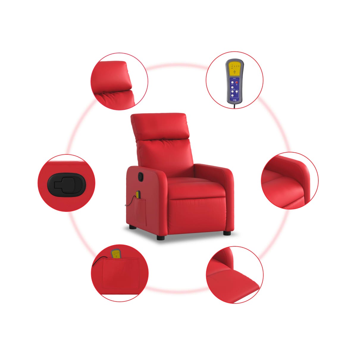 ¡Siéntate y descansa en este comodísimo sillón reclinable de masaje! Función de reclinado manual: Este sillón reclinable tiene un mango en el lado derecho. Con sólo tirar de él, puedes ajustar manualmente el reposapiés y el respaldo a cualquier posición que te resulte cómoda. Esta función permite una inclinación máxima de 135 grados. Además, el respaldo vuelve rápidamente a su posición original con solo tirar del mango.Función de vibración: Los 6 puntos de masaje te permiten disfrutar de un masaje mejor enfocado. Además, el mando incluido te permite elegir diferentes programas de masaje. La función de masaje funciona con el conector USB, pero no se incluye la fuente de alimentación USB de 5 V certificada.Cómodo asiento: El grueso acolchado del asiento, el respaldo y los anchos reposabrazos recubiertos de cuero sintético proporcionan una sensación acogedora y cálida, como si te estuvieran abrazando. El cuero sintético es un material muy duradero y resistente a las manchas, por lo que resulta fácil de limpiar con un paño húmedo. Además, la superficie lisa le confiere un aspecto lujoso y la belleza del cuero auténtico.Práctico bolsillo lateral: Este sillón cuenta con un bolsillo lateral para guardar el mando a distancia o mantener tus cosas al alcance de la mano.Estructura maciza y estable: La estructura, hecha de madera y metal, proporciona una estructura y una estabilidad fuertes. Este sillón reclinables es cómodo y duradero.
