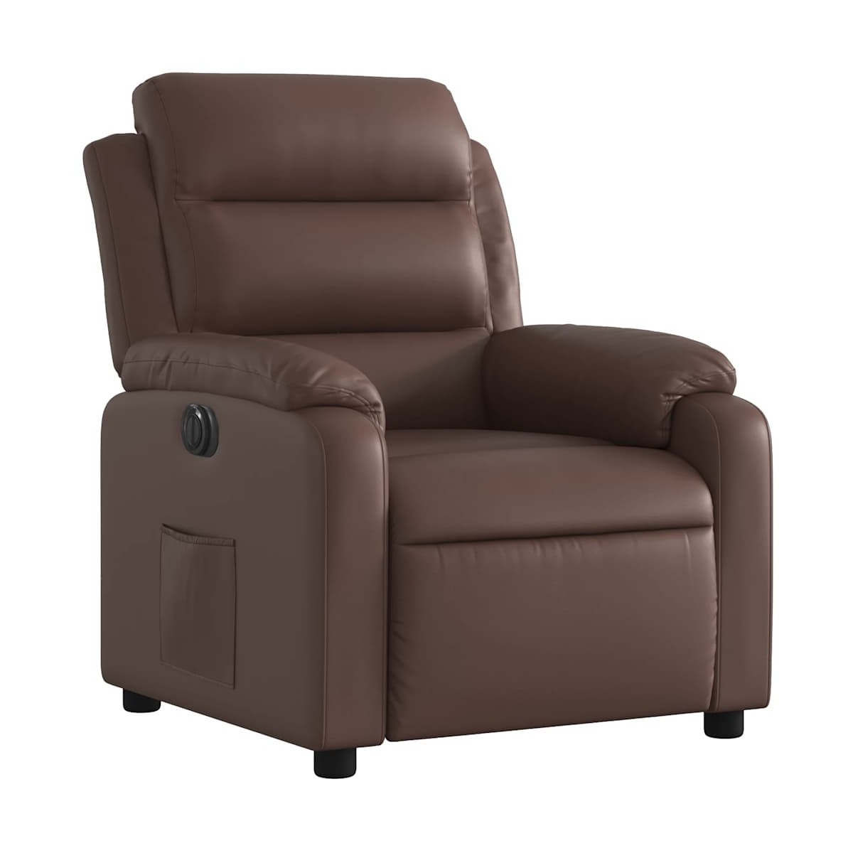 ¡Siéntate y descansa en este comodísimo sillón reclinable eléctrico! Función de reclinación eléctrica: Este sillón reclinable está equipado con un motor eléctrico para ajustar el reposapiés y el respaldo de forma automática a cualquier posición que desees con sólo pulsar el botón en el lateral del sillón. Esta característica permite una inclinación máxima de 135 grados. Además, el respaldo vuelve automáticamente a la posición original con sólo pulsar el botón.Cómodo asiento: El grueso acolchado del asiento, el respaldo y los anchos reposabrazos recubiertos de cuero sintético proporcionan una sensación acogedora y cálida, como si te estuvieran abrazando. El cuero sintético es un material muy duradero y resistente a las manchas, por lo que resulta fácil de limpiar con un paño húmedo. Además, la superficie lisa le confiere un aspecto lujoso y la belleza de la piel auténtica.Práctico bolsillo lateral: Este sillón tiene un bolsillo lateral para que guardes tus cosas al alcance de la mano.Estructura maciza y estable: La estructura, hecha de madera y metal, proporciona una estructura y una estabilidad fuertes. Este sillón reclinables es cómodo y duradero.