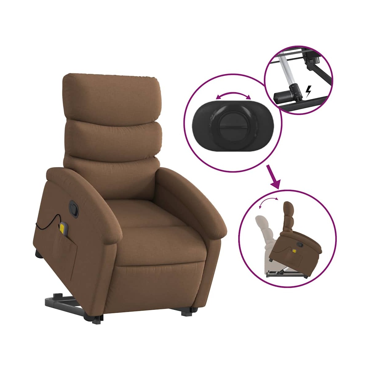 ¡Siéntate y descansa en este comodísimo sillón reclinable de masaje elevable! Función de elevación eléctrica: Este sillón reclinable para las personas mayores está equipado con un motor eléctrico para la función de elevación. Gracias a la función de elevación que empuja el sillón hacia arriba por completo, te puedes levantar fácilmente, sin tensiones en la espalda y las rodillas, con sólo pulsar el botón.Función de reclinado manual: Este sillón reclinable tiene un mango en el lado derecho. Con sólo tirar de él, puedes ajustar manualmente el reposapiés y el respaldo a cualquier posición que te resulte cómoda. Esta función permite una inclinación máxima de 135 grados. Además, el respaldo vuelve rápidamente a su posición original con solo tirar del mango.Función de vibración: Los 6 puntos de masaje te harán disfrutar de un masaje mejor enfocado. Además, el mando incluido te permite elegir diferentes programas de masaje. La función de masaje funciona a través del conector USB que requiere una fuente de alimentación USB de 5 V certificada (no incluida).Cómodo asiento: El mullido asiento , el respaldo y los amplios reposabrazos cubiertos de tela proporcionan una sensación cómoda y acogedora, para que estés de maravilla mientras estás sentado. La tela posee un aspecto sencillo y limpio, y es transpirable y duradera.Práctico bolsillo lateral: Este sillón cuenta con un bolsillo lateral para guardar el mando a distancia o mantener tus cosas al alcance de la mano.Estructura maciza y estable: La estructura, hecha de madera y metal, proporciona una estructura y una estabilidad fuertes. Este sillón reclinables es cómodo y duradero.