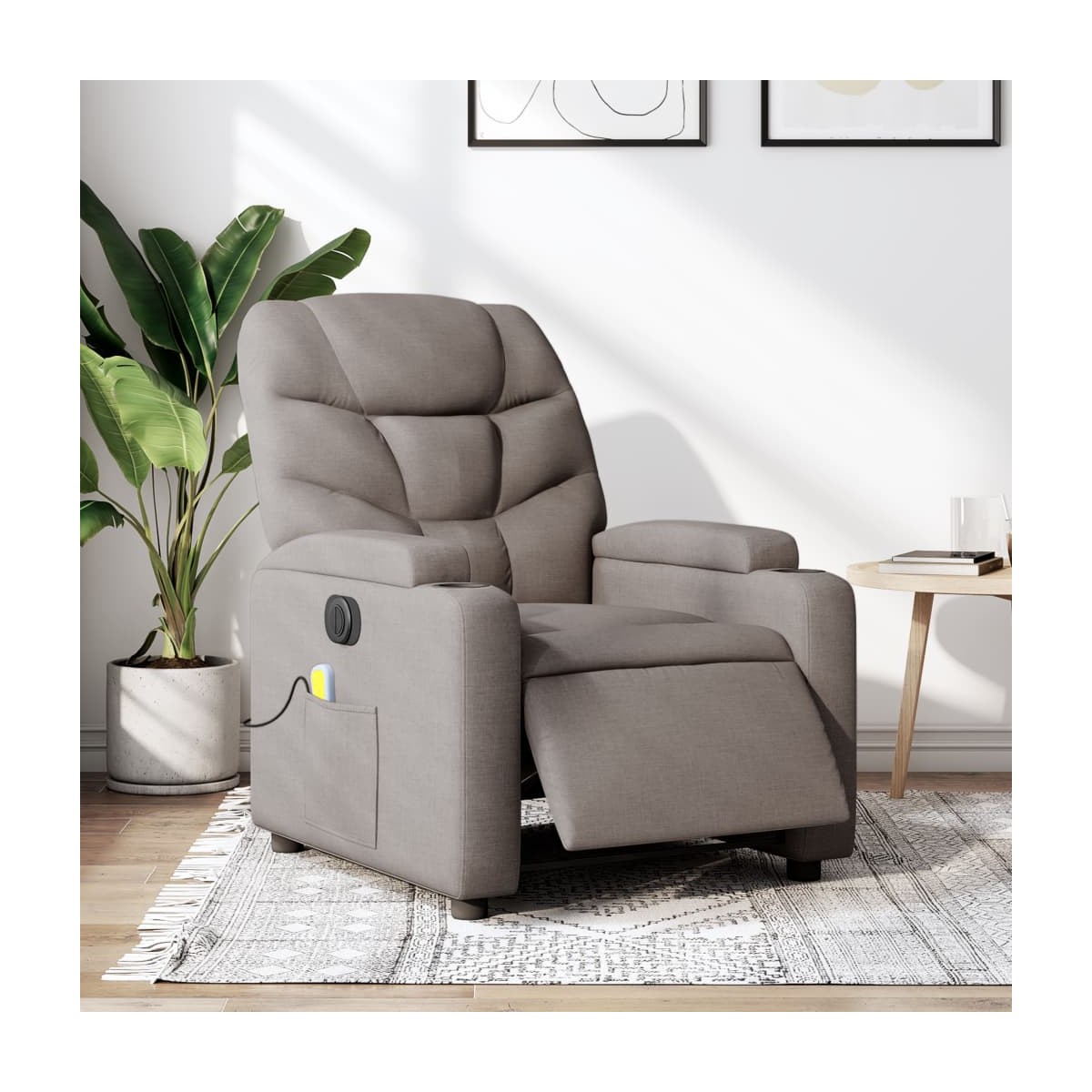 ¡Siéntate y descansa en este comodísimo sillón reclinable de masaje eléctrico! Función de reclinación eléctrica: Este sillón reclinable está equipado con un motor eléctrico para ajustar el reposapiés y el respaldo de forma automática a cualquier posición que desees con sólo pulsar el botón en el lateral del sillón. Esta característica permite una inclinación máxima de 135 grados. Además, el respaldo vuelve automáticamente a la posición original con sólo pulsar el botón.Función de vibración: Los 6 puntos de masaje te harán disfrutar de un masaje mejor enfocado. Además, el mando incluido te permite elegir diferentes programas de masaje. La función de masaje funciona a través del conector USB que requiere una fuente de alimentación USB de 5 V certificada (no incluida).Cómodo asiento: El mullido asiento , el respaldo y los amplios reposabrazos cubiertos de tela proporcionan una sensación cómoda y acogedora, para que estés de maravilla mientras estás sentado. La tela posee un aspecto sencillo y limpio, y es transpirable y duradera.Prácticos portavasos y bolsillo lateral: Este sillón cuenta con dos cómodos portavasos para las bebidas y un bolsillo lateral para que guardes cosas al alcance de la mano.Estructura maciza y estable: La estructura, hecha de madera y metal, proporciona una estructura y una estabilidad fuertes. Este sillón reclinables es cómodo y duradero.