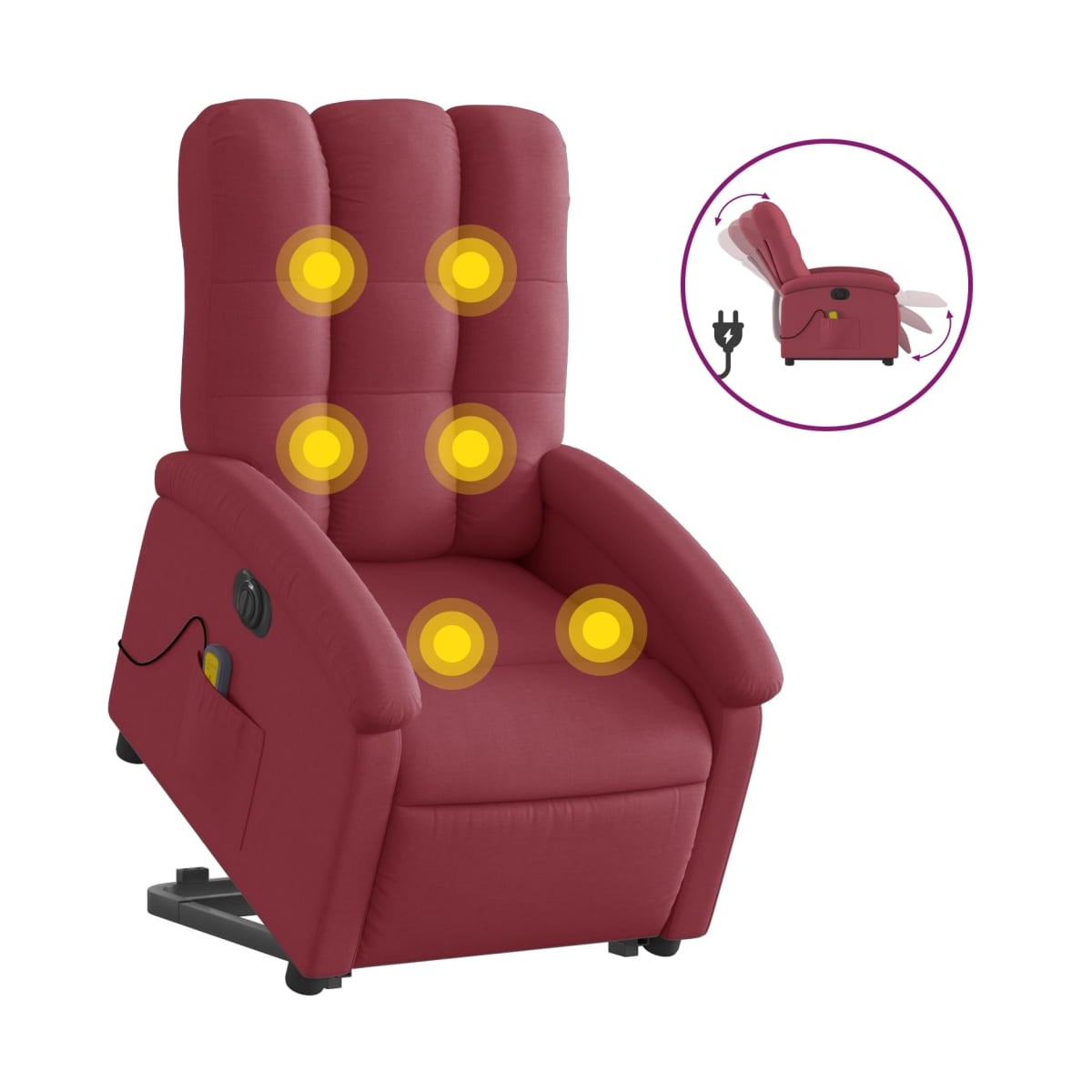 ¡Siéntate y déjate llevar en este cómodo sillón reclinable eléctrico! Función de elevación eléctrica: Este sillón reclinable para las personas mayores está equipado con un motor eléctrico para la función de elevación. Gracias a la función de elevación que empuja el sillón hacia arriba por completo, te puedes levantar fácilmente, sin tensiones en la espalda y las rodillas, con sólo pulsar el botón.Función reclinable eléctrica: Este sillón reclinable también está equipado con un motor eléctrico que ayuda a ajustar automáticamente el reposapiés y el respaldo a cualquier posición según tu comodidad con solo presionar el botón en el lateral del sillón. Esta característica permite una inclinación máxima de 135 grados. Además, el respaldo puede volver automáticamente a su lugar original con solo presionar un botón.Función de vibración: Los 6 puntos de masaje te harán disfrutar de un masaje mejor enfocado. Además, el mando incluido te permite elegir diferentes programas de masaje. La función de masaje funciona a través del conector USB que requiere una fuente de alimentación USB de 5 V certificada (no incluida).Cómodo asiento: El mullido asiento, el respaldo y los amplios reposabrazos cubiertos de tela proporcionan una sensación cómoda y acogedora, para que estés de maravilla mientras estás sentado. La tela posee un aspecto sencillo y limpio, y es transpirable y duradera.Práctico bolsillo lateral: Este sillón cuenta con un bolsillo lateral para guardar el mando a distancia o mantener tus cosas al alcance de la mano.Estructura maciza y estable: La estructura, hecha de madera y metal, proporciona una estructura y una estabilidad fuertes. Este sillón reclinables es cómodo y duradero.