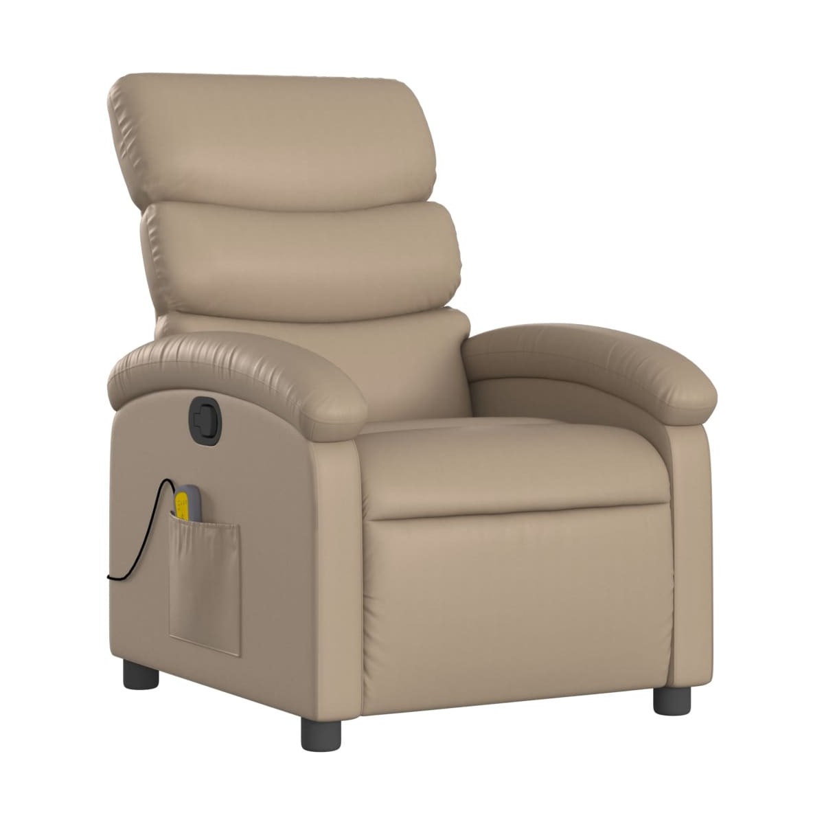 ¡Siéntate y descansa en este comodísimo sillón reclinable de masaje! Función de reclinado manual: Este sillón reclinable tiene un mango en el lado derecho. Con sólo tirar de él, puedes ajustar manualmente el reposapiés y el respaldo a cualquier posición que te resulte cómoda. Esta función permite una inclinación máxima de 135 grados. Además, el respaldo vuelve rápidamente a su posición original con solo tirar del mango.Función de vibración: Los 6 puntos de masaje te permiten disfrutar de un masaje mejor enfocado. Además, el mando incluido te permite elegir diferentes programas de masaje. La función de masaje funciona con el conector USB, pero no se incluye la fuente de alimentación USB de 5 V certificada.Cómodo asiento: El grueso acolchado del asiento, el respaldo y los anchos reposabrazos recubiertos de cuero sintético proporcionan una sensación acogedora y cálida, como si te estuvieran abrazando. El cuero sintético es un material muy duradero y resistente a las manchas, por lo que resulta fácil de limpiar con un paño húmedo. Además, la superficie lisa le confiere un aspecto lujoso y la belleza del cuero auténtico.Práctico bolsillo lateral: Este sillón cuenta con un bolsillo lateral para guardar el mando a distancia o mantener tus cosas al alcance de la mano.Estructura maciza y estable: La estructura, hecha de madera y metal, proporciona una estructura y una estabilidad fuertes. Este sillón reclinables es cómodo y duradero.