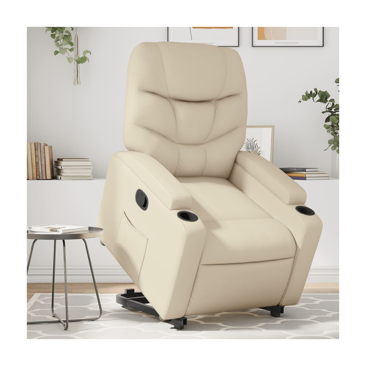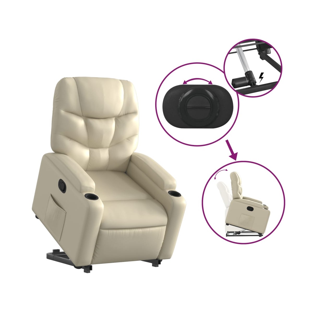 ¡Siéntate y descansa en este comodísimo sillón reclinable elevador! Función de elevación eléctrica: Este sillón reclinable para las personas mayores está equipado con un motor eléctrico para la función de elevación. Gracias a la función de elevación que empuja el sillón hacia arriba por completo, te puedes levantar fácilmente, sin tensiones en la espalda y las rodillas, con sólo pulsar el botón.Función de reclinado manual: Este sillón reclinable tiene un mango en el lado derecho. Con sólo tirar de él, puedes ajustar manualmente el reposapiés y el respaldo a cualquier posición que te resulte cómoda. Esta función permite una inclinación máxima de 135 grados. Además, el respaldo vuelve rápidamente a su posición original con solo tirar del mango.Cómodo asiento: El grueso acolchado del asiento, el respaldo y los anchos reposabrazos recubiertos de cuero sintético proporcionan una sensación acogedora y cálida, como si te estuvieran abrazando. El cuero sintético es un material muy duradero y resistente a las manchas, por lo que resulta fácil de limpiar con un paño húmedo. Además, la superficie lisa le confiere un aspecto lujoso y la belleza del cuero auténtico.Prácticos portavasos y bolsillo lateral: Este sillón cuenta con dos cómodos portavasos para las bebidas y un bolsillo lateral para que guardes cosas al alcance de la mano.Estructura maciza y estable: La estructura, hecha de madera y metal, proporciona una estructura y una estabilidad fuertes. Este sillón reclinables es cómodo y duradero.