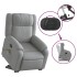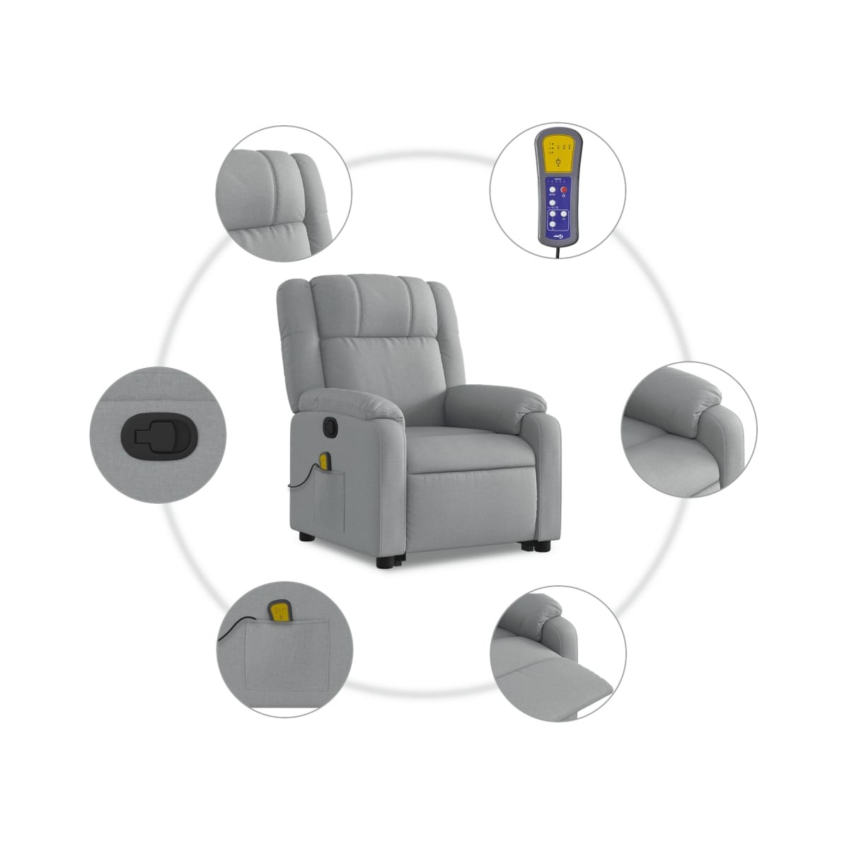 ¡Siéntate y descansa en este comodísimo sillón reclinable de masaje elevable! Función de elevación eléctrica: Este sillón reclinable para las personas mayores está equipado con un motor eléctrico para la función de elevación. Gracias a la función de elevación que empuja el sillón hacia arriba por completo, te puedes levantar fácilmente, sin tensiones en la espalda y las rodillas, con sólo pulsar el botón.Función de reclinado manual: Este sillón reclinable tiene un mango en el lado derecho. Con sólo tirar de él, puedes ajustar manualmente el reposapiés y el respaldo a cualquier posición que te resulte cómoda. Esta función permite una inclinación máxima de 135 grados. Además, el respaldo vuelve rápidamente a su posición original con solo tirar del mango.Función de vibración: Los 6 puntos de masaje te harán disfrutar de un masaje mejor enfocado. Además, el mando incluido te permite elegir diferentes programas de masaje. La función de masaje funciona a través del conector USB que requiere una fuente de alimentación USB de 5 V certificada (no incluida).Cómodo asiento: El mullido asiento , el respaldo y los amplios reposabrazos cubiertos de tela proporcionan una sensación cómoda y acogedora, para que estés de maravilla mientras estás sentado. La tela posee un aspecto sencillo y limpio, y es transpirable y duradera.Práctico bolsillo lateral: Este sillón cuenta con un bolsillo lateral para guardar el mando a distancia o mantener tus cosas al alcance de la mano.Estructura maciza y estable: La estructura, hecha de madera y metal, proporciona una estructura y una estabilidad fuertes. Este sillón reclinables es cómodo y duradero.