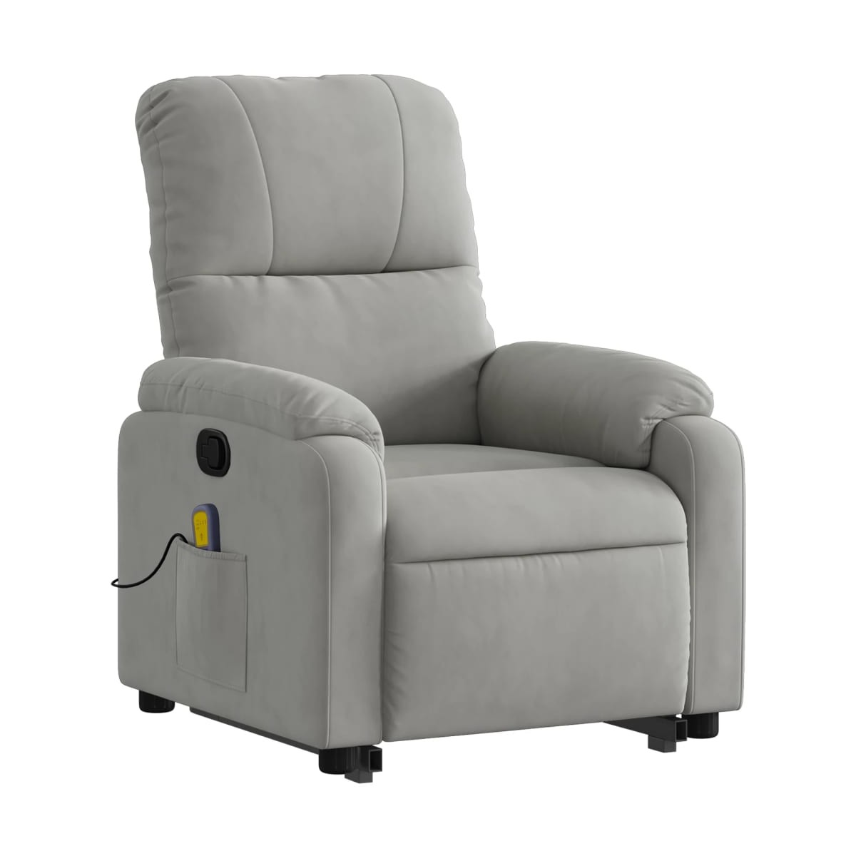 ¡Siéntate y descansa en este comodísimo sillón reclinable de masaje elevable! Función de elevación eléctrica: Este sillón reclinable para las personas mayores está equipado con un motor eléctrico para la función de elevación. Gracias a la función de elevación que empuja el sillón hacia arriba por completo, te puedes levantar fácilmente, sin tensiones en la espalda y las rodillas, con sólo pulsar el botón.Función de reclinado manual: Este sillón reclinable tiene un mango en el lado derecho. Con sólo tirar de él, puedes ajustar manualmente el reposapiés y el respaldo a cualquier posición que te resulte cómoda. Esta función permite una inclinación máxima de 135 grados. Además, el respaldo vuelve rápidamente a su posición original con solo tirar del mango.Función de vibración: Los 6 puntos de masaje te harán disfrutar de un masaje mejor enfocado. Además, el mando incluido te permite elegir diferentes programas de masaje. La función de masaje funciona a través del conector USB que requiere una fuente de alimentación USB de 5 V certificada (no incluida).Cómodo asiento: El grueso acolchado del asiento, el respaldo y los anchos reposabrazos recubiertos de microfibra proporcionan una sensación acogedora y cálida, como si te estuvieran abrazando. La microfibra es un tejido sintético compuesto por fibras ultrafinas, especialmente impermeables a las manchas. El tejido de microfibra es una gran opción para la tapicería de muebles por su durabilidad y fácil limpieza.Práctico bolsillo lateral: Este sillón cuenta con un bolsillo lateral para guardar el mando a distancia o mantener tus cosas al alcance de la mano.Estructura maciza y estable: La estructura, hecha de madera y metal, proporciona una estructura y una estabilidad fuertes. Este sillón reclinables es cómodo y duradero.
