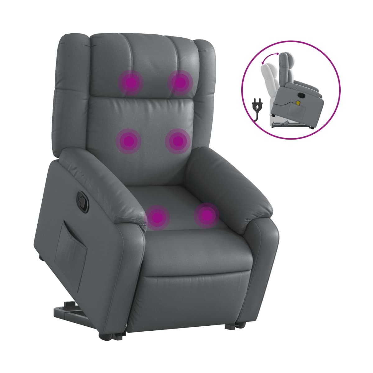 ¡Siéntate y descansa en este comodísimo sillón reclinable de masaje elevable! Función de elevación eléctrica: Este sillón reclinable para las personas mayores está equipado con un motor eléctrico para la función de elevación. Gracias a la función de elevación que empuja el sillón hacia arriba por completo, te puedes levantar fácilmente, sin tensiones en la espalda y las rodillas, con sólo pulsar el botón.Función de reclinado manual: Este sillón reclinable tiene un mango en el lado derecho. Con sólo tirar de él, puedes ajustar manualmente el reposapiés y el respaldo a cualquier posición que te resulte cómoda. Esta función permite una inclinación máxima de 135 grados. Además, el respaldo vuelve rápidamente a su posición original con solo tirar del mango.Función de vibración: Los 6 puntos de masaje te harán disfrutar de un masaje mejor enfocado. Además, el mando incluido te permite elegir diferentes programas de masaje. La función de masaje funciona a través del conector USB que requiere una fuente de alimentación USB de 5 V certificada (no incluida).Cómodo asiento: El grueso acolchado del asiento, el respaldo y los anchos reposabrazos recubiertos de cuero sintético proporcionan una sensación acogedora y cálida, como si te estuvieran abrazando. El cuero sintético es un material muy duradero y resistente a las manchas, por lo que resulta fácil de limpiar con un paño húmedo. Además, la superficie lisa le confiere un aspecto lujoso y la belleza de la piel auténtica.Práctico bolsillo lateral: Este sillón cuenta con un bolsillo lateral para guardar el mando a distancia o mantener tus cosas al alcance de la mano.Estructura maciza y estable: La estructura, hecha de madera y metal, proporciona una estructura y una estabilidad fuertes. Este sillón reclinables es cómodo y duradero.