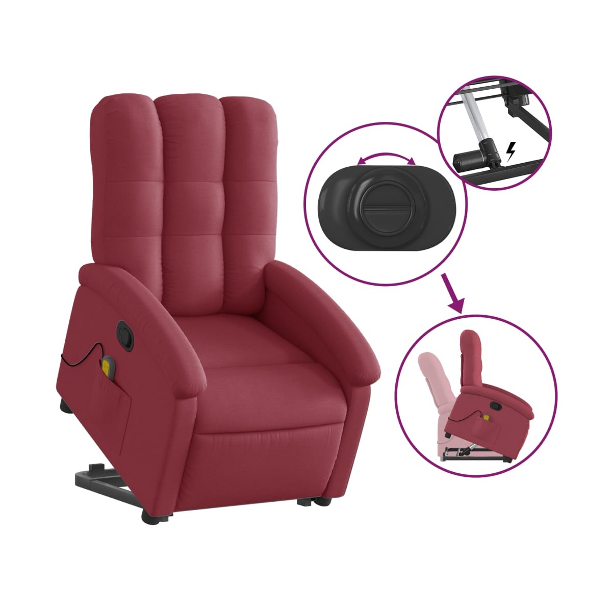 ¡Siéntate y descansa en este comodísimo sillón reclinable de masaje elevable! Función de elevación eléctrica: Este sillón reclinable para las personas mayores está equipado con un motor eléctrico para la función de elevación. Gracias a la función de elevación que empuja el sillón hacia arriba por completo, te puedes levantar fácilmente, sin tensiones en la espalda y las rodillas, con sólo pulsar el botón.Función de reclinado manual: Este sillón reclinable tiene un mango en el lado derecho. Con sólo tirar de él, puedes ajustar manualmente el reposapiés y el respaldo a cualquier posición que te resulte cómoda. Esta función permite una inclinación máxima de 135 grados. Además, el respaldo vuelve rápidamente a su posición original con solo tirar del mango.Función de vibración: Los 6 puntos de masaje te harán disfrutar de un masaje mejor enfocado. Además, el mando incluido te permite elegir diferentes programas de masaje. La función de masaje funciona a través del conector USB que requiere una fuente de alimentación USB de 5 V certificada (no incluida).Cómodo asiento: El mullido asiento , el respaldo y los amplios reposabrazos cubiertos de tela proporcionan una sensación cómoda y acogedora, para que estés de maravilla mientras estás sentado. La tela posee un aspecto sencillo y limpio, y es transpirable y duradera.Práctico bolsillo lateral: Este sillón cuenta con un bolsillo lateral para guardar el mando a distancia o mantener tus cosas al alcance de la mano.Estructura maciza y estable: La estructura, hecha de madera y metal, proporciona una estructura y una estabilidad fuertes. Este sillón reclinables es cómodo y duradero.