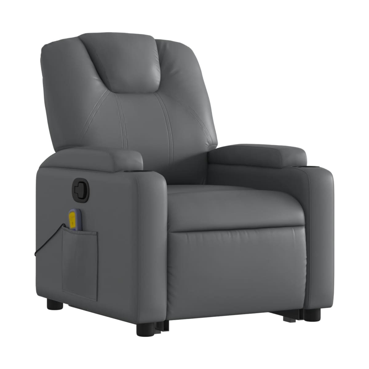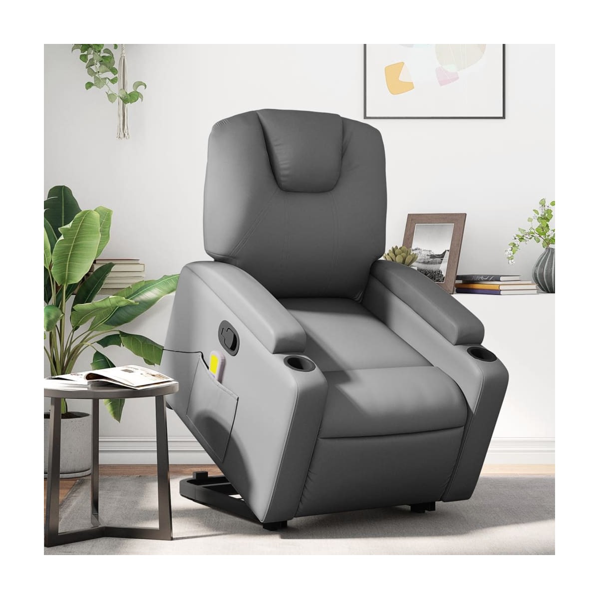 ¡Siéntate y descansa en este comodísimo sillón reclinable de masaje elevable! Función de elevación eléctrica: Este sillón reclinable para las personas mayores está equipado con un motor eléctrico para la función de elevación. Gracias a la función de elevación que empuja el sillón hacia arriba por completo, te puedes levantar fácilmente, sin tensiones en la espalda y las rodillas, con sólo pulsar el botón.Función de reclinado manual: Este sillón reclinable tiene un mango en el lado derecho. Con sólo tirar de él, puedes ajustar manualmente el reposapiés y el respaldo a cualquier posición que te resulte cómoda. Esta función permite una inclinación máxima de 135 grados. Además, el respaldo vuelve rápidamente a su posición original con solo tirar del mango.Función de vibración: Los 6 puntos de masaje te harán disfrutar de un masaje mejor enfocado. Además, el mando incluido te permite elegir diferentes programas de masaje. La función de masaje funciona a través del conector USB que requiere una fuente de alimentación USB de 5 V certificada (no incluida).Cómodo asiento: El grueso acolchado del asiento, el respaldo y los anchos reposabrazos recubiertos de cuero sintético proporcionan una sensación acogedora y cálida, como si te estuvieran abrazando. El cuero sintético es un material muy duradero y resistente a las manchas, por lo que resulta fácil de limpiar con un paño húmedo. Además, la superficie lisa le confiere un aspecto lujoso y la belleza del cuero auténtico.Prácticos portavasos y bolsillo lateral: Este sillón cuenta con dos cómodos portavasos para las bebidas y un bolsillo lateral para que tengas tus cosas al alcance de la mano.Estructura maciza y estable: La estructura, hecha de madera y metal, proporciona una estructura y una estabilidad fuertes. Este sillón reclinables es cómodo y duradero.