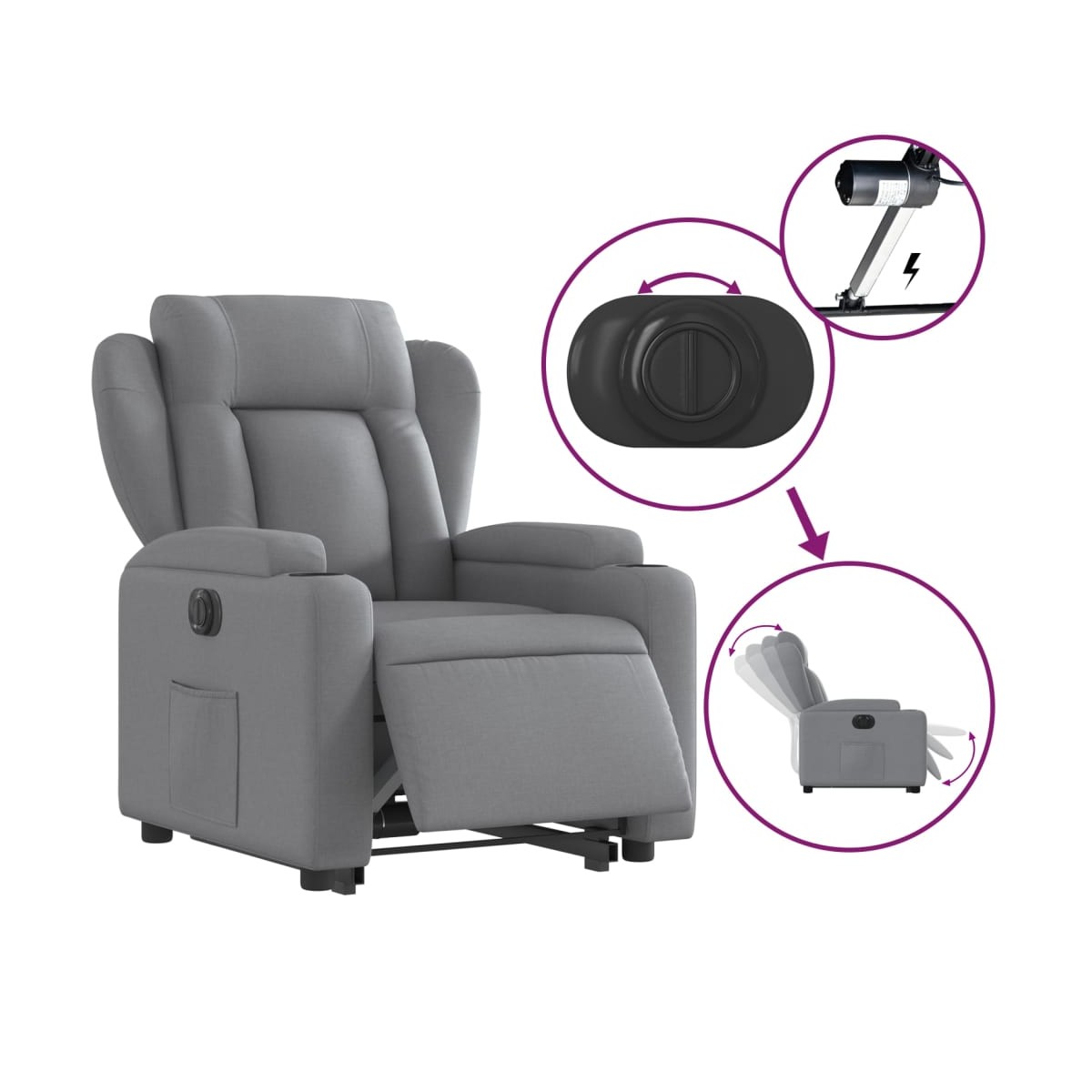 ¡Siéntate y déjate llevar en este comodísimo sillón reclinable y elevable eléctrico! Función de elevación eléctrica: Este sillón reclinable para las personas mayores está equipado con un motor eléctrico para la función de elevación. Gracias a la función de elevación que empuja el sillón hacia arriba por completo, te puedes levantar fácilmente, sin tensiones en la espalda y las rodillas, con sólo pulsar el botón.Función reclinable eléctrica: Este sillón reclinable también está equipado con un motor eléctrico que ayuda a ajustar el reposapiés y el respaldo de forma automática a cualquier posición que desees con solo presionar el botón en el lateral del sillón. Esta característica permite una inclinación máxima de 135 grados. Además, el respaldo vuelve automáticamente al lugar original con solo presionar el botón.Cómodo asiento: El mullido asiento , el respaldo y los amplios reposabrazos cubiertos de tela proporcionan una sensación cómoda y acogedora, para que estés de maravilla mientras estás sentado. La tela posee un aspecto sencillo y limpio, y es transpirable y duradera.Prácticos portavasos y bolsillo lateral: Este sillón cuenta con dos cómodos portavasos para las bebidas y un bolsillo lateral para que guardes cosas al alcance de la mano.Estructura maciza y estable: La estructura, hecha de madera y metal, proporciona una estructura y una estabilidad fuertes. Este sillón reclinables es cómodo y duradero.