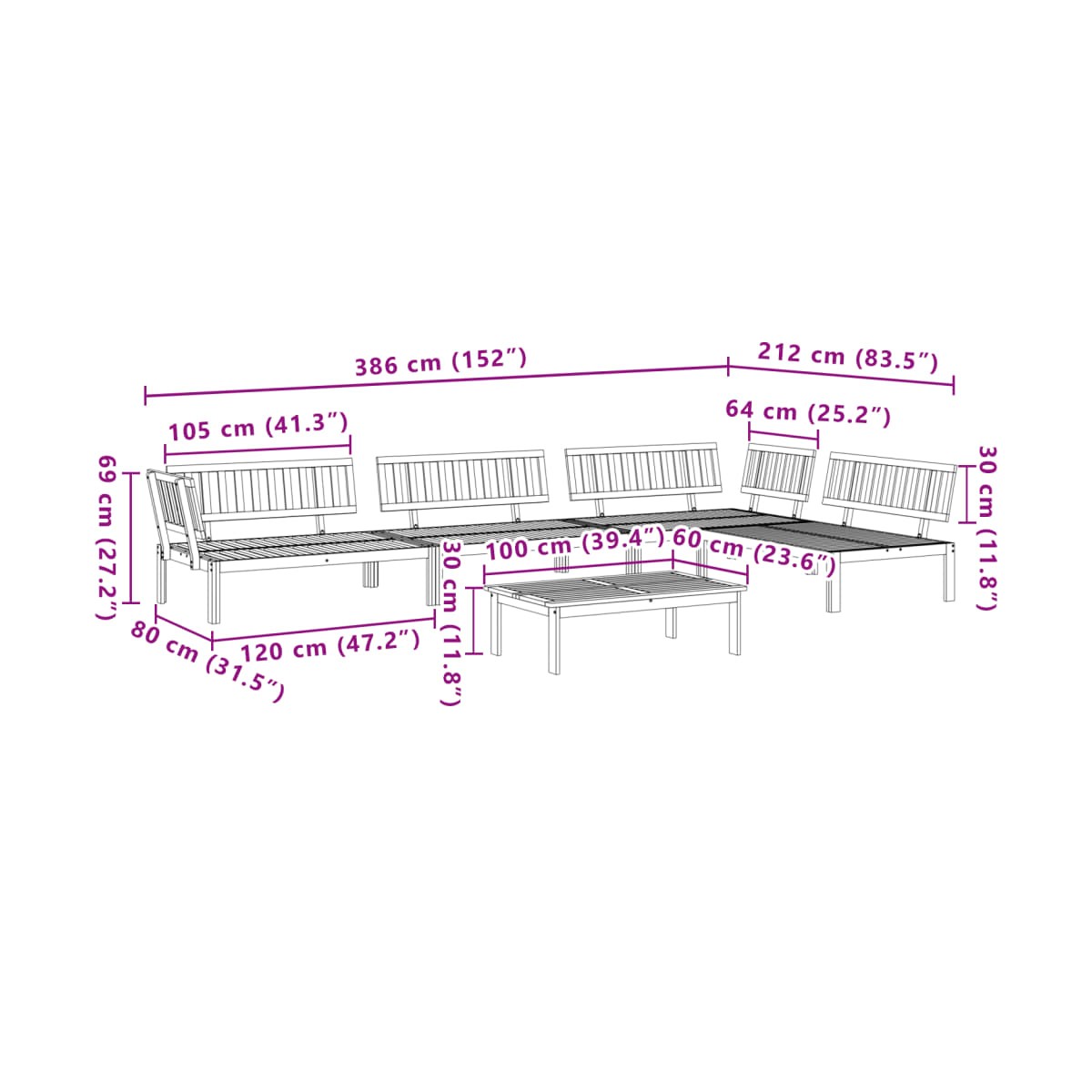 Este conjunto de sofá de palets de madera incluye 1 mesa y 4 sofás. Es una excelente opción para usarse al aire libre y relajarse. Material duradero: La madera maciza de acacia es un bonito material natural. La madera de acacia es una madera dura tropical, densa, robusta y duradera. Su acabado al aceite hace que el conjunto de muebles sea adecuado para su uso en exteriores.Cómodo asiento: El respaldo aporta un plus de comodidad al sofá de exterior. Diseño modular: El sofá seccional es flexible y fácil de mover. ¡Puedes combinarlo con otros segmentos modulares disponibles en el menú desplegable para crear tus propias configuraciones personales de juegos de jardín! Información útil:Para asegurarte de que tus muebles de exterior se mantengan hermosos, recomendamos protegerlos con una funda impermeable.El cojín no está incluido en este sofá de palets. Ofrecemos un cojín de palets estándar de 120x80 cm. Puedes echar un vistazo a nuestra tienda para buscar un colchón correspondiente.