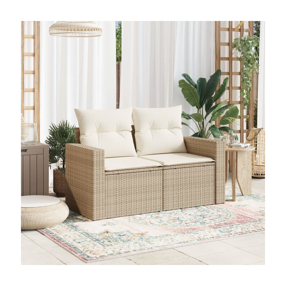 ¡Relájate y disfruta del aire libre en este cómodo sofá de jardín de 2 plazas! Material duradero: El ratán de PE, también conocido como ratán sintético, es un material sintético resistente y de bajo mantenimiento que se parece al ratán natural. Es ligero, fácil de limpiar y se usa comúnmente para muebles de exterior debido a su durabilidad y propiedades resistentes a la intemperie.Experiencia de asiento cómoda: Estos muebles de exterior, completos con cojines acolchados gruesos, ofrecen una experiencia de asiento cómoda. Los anchos reposabrazos también ofrecen un lugar práctico para guardar el móvil, tazas u otros objetos pequeños al alcance de la mano.Funda desenfundable y lavable: Estos cojines de asiento cuentan con fundas desenfundables para facilitar el lavado y mantenimiento.Diseño modular: Este conjunto de muebles de exterior tiene un diseño modular, por lo que es completamente flexible y fácil de mover, para que puedas crear una disposición de muebles de exterior personalizada. Información útil:Para asegurarte de que tus muebles de exterior se mantengan hermosos, recomendamos protegerlos con una funda impermeable.
