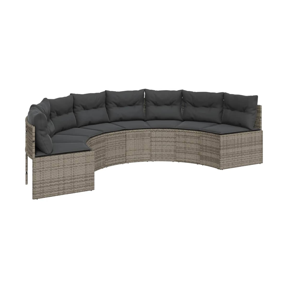 Este sofá de jardín de forma semicircular es el complemento perfecto para tu jardín, terraza o patio, ya que proporciona un espacio cómodo y acogedor para charlar con familiares y amigos o simplemente relajarse y disfrutar del aire libre. Material duradero: El ratán PE, también conocido como ratán sintético, es un material sintético resistente y de bajo mantenimiento que se parece al ratán natural. Es ligero, fácil de limpiar y se usa comúnmente para muebles de exterior debido a su durabilidad y propiedades resistentes a la intemperie.Experiencia de asiento cómoda: Estos muebles de exterior, completos con cojines acolchados gruesos, ofrecen una experiencia de asiento cómoda.Funda desenfundable y lavable: Estos cojines de asiento cuentan con fundas desenfundables para facilitar el lavado y mantenimiento.Estructura robusta y estable: La estructura de acero con recubrimiento en polvo garantiza que el mueble de jardín sea resistente y estable para usarlo a diario al aire libre. Información útil:Para asegurarte de que tus muebles de exterior se mantengan hermosos, recomendamos protegerlos con una funda impermeable.