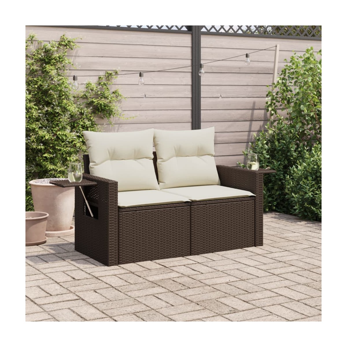 ¡Relájate y disfruta del aire libre en este cómodo sofá de jardín de 2 plazas! Material duradero: El ratán de PE, también conocido como ratán sintético, es un material sintético resistente y de bajo mantenimiento que se parece al ratán natural. Es ligero, fácil de limpiar y se usa comúnmente para muebles de exterior debido a su durabilidad y propiedades resistentes a la intemperie.Cómoda mesa auxiliar: Este mueble de exterior cuenta con una mesa auxiliar plegable con un resorte de gas en los reposabrazos, lo que proporciona un lugar conveniente para mantener tus elementos esenciales al alcance de la mano.Experiencia de asiento cómoda: Estos muebles de exterior, completos con cojines acolchados gruesos, ofrecen una experiencia de asiento cómoda.Funda desenfundable y lavable: Estos cojines de asiento cuentan con fundas desenfundables para facilitar el lavado y mantenimiento.Diseño modular: Este conjunto de muebles de exterior tiene un diseño modular, por lo que es completamente flexible y fácil de mover, para que puedas crear una disposición de muebles de exterior personalizada. Información útil:Para asegurarte de que tus muebles de exterior se mantengan hermosos, recomendamos protegerlos con una funda impermeable.