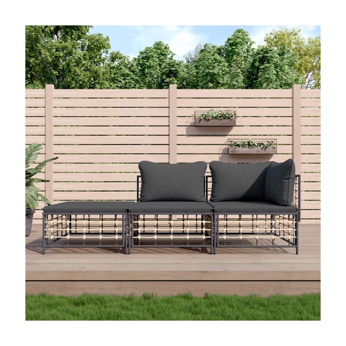¡Disfruta de un agradable café en el espacio al aire libre de la casa con este juego de muebles para jardín! Es un aporte perfecto para el jardín y la terraza, y crea además una impresión duradera. Material resistente a la intemperie: El ratán sintético es resistente a la intemperie y fácil de limpiar. La parte exterior se mantiene hermosa durante mucho tiempo. Es más económico que otros materiales, además de ofrecer una gran calidad, comodidad y aspecto estético.Estructura robusta y estable: La estructura de acero del conjunto de muebles garantiza su solidez y estabilidad.Cómodo asiento: El respaldo aporta un plus de comodidad al juego de muebles. Además, los cojines gruesos y acolchados proporcionan comodidad al asiento.Diseño modular: El juego de muebles de jardín es flexible y fácil de mover, por lo que puedes combinarlo con otros segmentos modulares de la tienda web para crear tus propias configuraciones personales de juegos de muebles para jardín. Nota:Para asegurarte de que tus muebles de exterior se mantengan hermosos, recomendamos protegerlos con una funda impermeable.