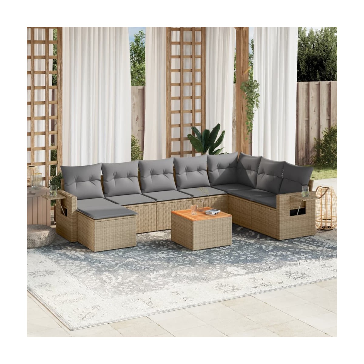 Este conjunto de sofás de jardín es el complemento perfecto para el jardín, terraza o patio, ya que proporciona un espacio confortable y acogedor para charlar con familiares y amigos o simplemente relajarte y disfrutar del aire libre. Material duradero: El ratán PE, también conocido como ratán sintético, es un material sintético resistente y de bajo mantenimiento que se parece al ratán natural. Es ligero, fácil de limpiar y se usa comúnmente para muebles de exterior debido a su durabilidad y propiedades resistentes a la intemperie.Cómoda mesa auxiliar: Este mueble de exterior cuenta con una mesa auxiliar plegable con un resorte de gas en los reposabrazos, lo que proporciona un lugar conveniente para mantener tus elementos esenciales al alcance de la mano.Superficie estable y fácil de limpiar: Esta mesa de jardín tiene una superficie de madera de acacia que es resistente, duradero y fácil de limpiar con un paño húmedo.Funda desenfundable y lavable: Estos cojines de asiento cuentan con fundas desenfundables para facilitar el lavado y mantenimiento.Diseño modular: Este conjunto de muebles de exterior tiene un diseño modular, por lo que es completamente flexible y fácil de mover, para que puedas crear una disposición de muebles de exterior personalizada. Información útil:Para asegurarte de que tus muebles de exterior se mantengan hermosos, recomendamos protegerlos con una funda impermeable.