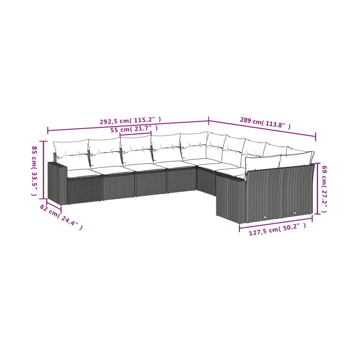 - Dimensiones del cojín de asiento: 55 x 55 x 3 cm (ancho x profundo x grosor)