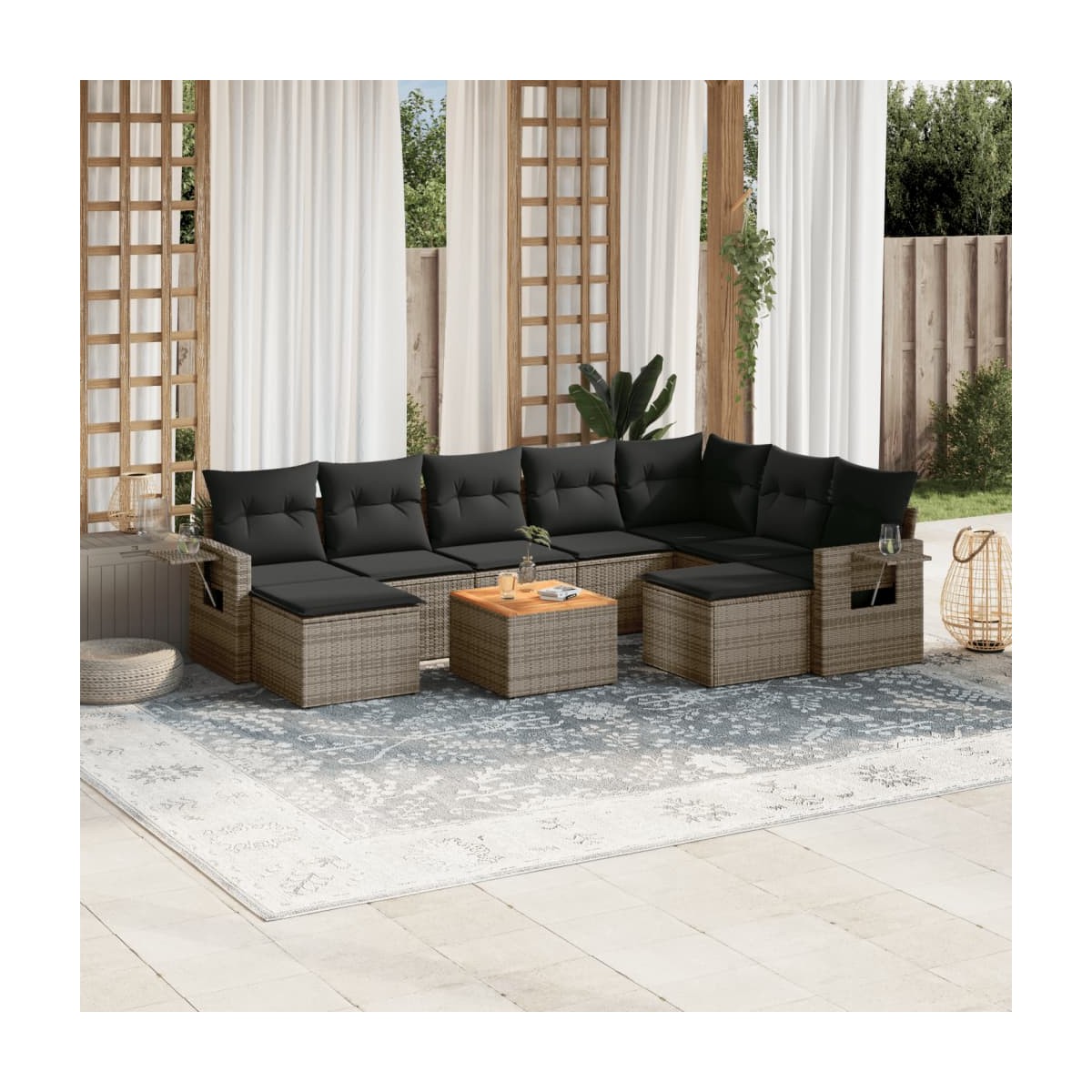 Este conjunto de sofás de jardín es el complemento perfecto para el jardín, terraza o patio, ya que proporciona un espacio confortable y acogedor para charlar con familiares y amigos o simplemente relajarte y disfrutar del aire libre. Material duradero: El ratán PE, también conocido como ratán sintético, es un material sintético resistente y de bajo mantenimiento que se parece al ratán natural. Es ligero, fácil de limpiar y se usa comúnmente para muebles de exterior debido a su durabilidad y propiedades resistentes a la intemperie.Cómoda mesa auxiliar: Este mueble de exterior cuenta con una mesa auxiliar plegable con un resorte de gas en los reposabrazos, lo que proporciona un lugar conveniente para mantener tus elementos esenciales al alcance de la mano.Superficie estable y fácil de limpiar: Esta mesa de jardín tiene una superficie de madera de acacia que es resistente, duradero y fácil de limpiar con un paño húmedo.Funda desenfundable y lavable: Estos cojines de asiento cuentan con fundas desenfundables para facilitar el lavado y mantenimiento.Diseño modular: Este conjunto de muebles de exterior tiene un diseño modular, por lo que es completamente flexible y fácil de mover, para que puedas crear una disposición de muebles de exterior personalizada. Información útil:Para asegurarte de que tus muebles de exterior se mantengan hermosos, recomendamos protegerlos con una funda impermeable.