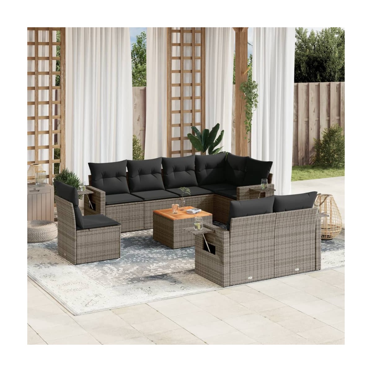 Este conjunto de sofás de jardín es el complemento perfecto para el jardín, terraza o patio, ya que proporciona un espacio confortable y acogedor para charlar con familiares y amigos o simplemente relajarte y disfrutar del aire libre. Material duradero: El ratán PE, también conocido como ratán sintético, es un material sintético resistente y de bajo mantenimiento que se parece al ratán natural. Es ligero, fácil de limpiar y se usa comúnmente para muebles de exterior debido a su durabilidad y propiedades resistentes a la intemperie.Cómoda mesa auxiliar: Este mueble de exterior cuenta con una mesa auxiliar plegable con un resorte de gas en los reposabrazos, lo que proporciona un lugar conveniente para mantener tus elementos esenciales al alcance de la mano.Superficie estable y fácil de limpiar: Esta mesa de jardín tiene una superficie de madera de acacia que es resistente, duradero y fácil de limpiar con un paño húmedo.Funda desenfundable y lavable: Estos cojines de asiento cuentan con fundas desenfundables para facilitar el lavado y mantenimiento.Diseño modular: Este conjunto de muebles de exterior tiene un diseño modular, por lo que es completamente flexible y fácil de mover, para que puedas crear una disposición de muebles de exterior personalizada. Información útil:Para asegurarte de que tus muebles de exterior se mantengan hermosos, recomendamos protegerlos con una funda impermeable.