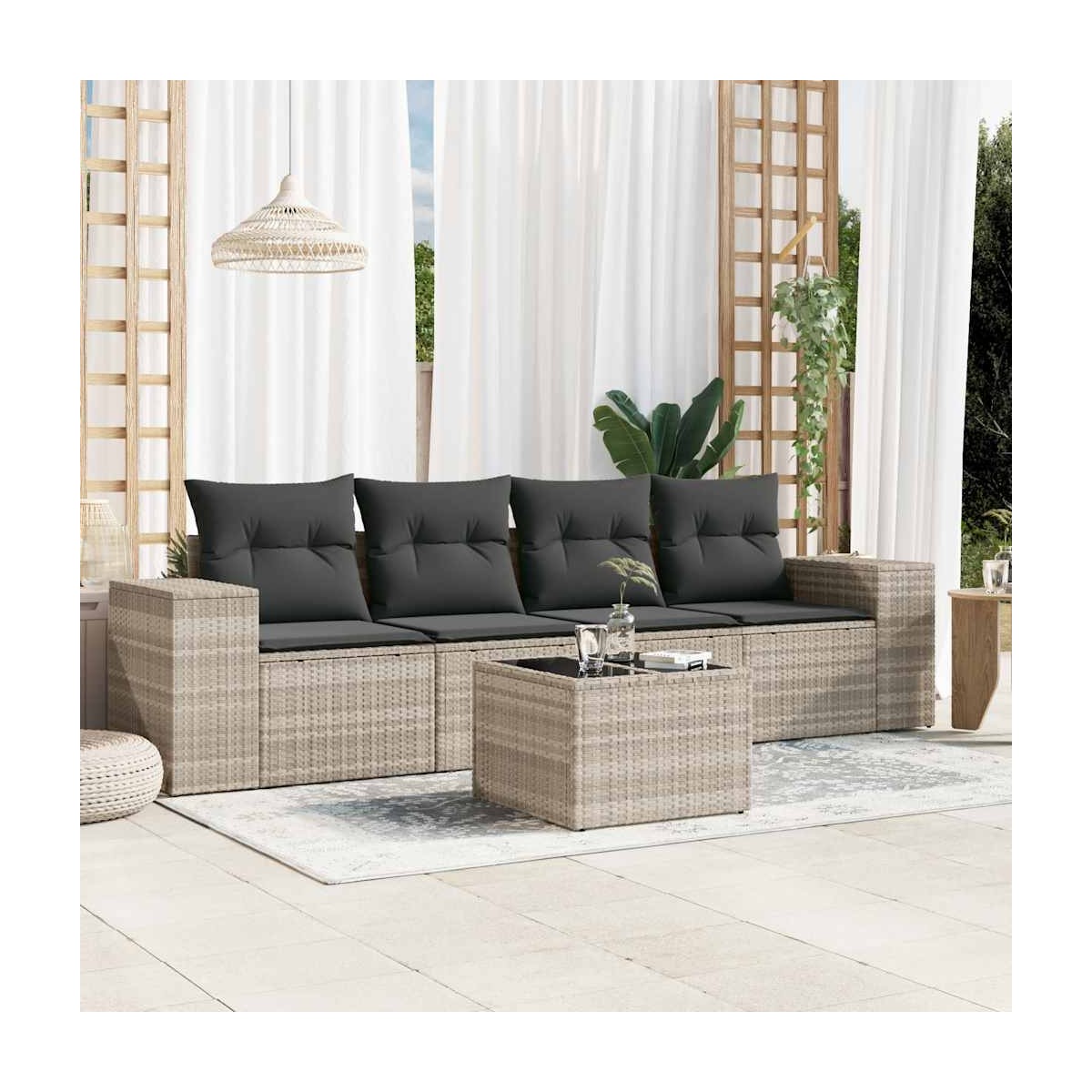 Este conjunto de sofás de jardín es el complemento perfecto para el jardín, terraza o patio, ya que proporciona un espacio confortable y acogedor para charlar con familiares y amigos o simplemente relajarte y disfrutar del aire libre. Material duradero: El ratán PE, también conocido como ratán sintético, es un material sintético resistente y de bajo mantenimiento que se parece al ratán natural. Es ligero, fácil de limpiar y se usa comúnmente para muebles de exterior debido a su durabilidad y propiedades resistentes a la intemperie.Superficie de vidrio: La superficie de la mesa de exterior es de vidrio templado resistente y duradero, por lo que es fácil de limpiar con un paño húmedo y añade un toque de elegancia a tu espacio exterior.Experiencia de asiento cómoda: Estos muebles de exterior, completos con cojines acolchados gruesos, ofrecen una experiencia de asiento cómoda.Funda desenfundable y lavable: Estos cojines de asiento cuentan con fundas desenfundables para facilitar el lavado y mantenimiento.Diseño modular: Este conjunto de muebles de exterior tiene un diseño modular, por lo que es completamente flexible y fácil de mover, para que puedas crear una disposición de muebles de exterior personalizada. Información útil:Para asegurarte de que tus muebles de exterior se mantengan hermosos, recomendamos protegerlos con una funda impermeable.