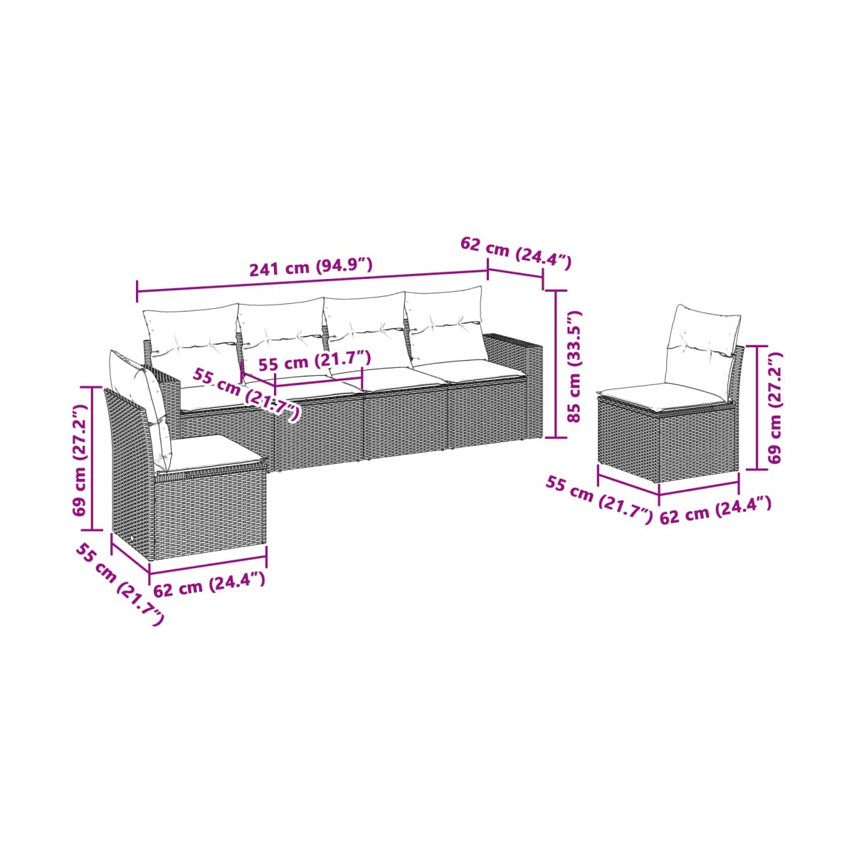 - Dimensiones del cojín de asiento: 55 x 55 x 3 cm (ancho x profundo x grosor)