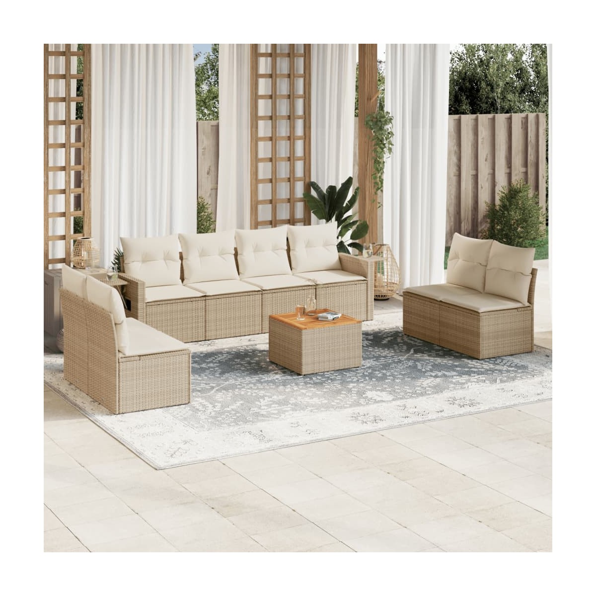 Este conjunto de sofás de jardín es el complemento perfecto para el jardín, terraza o patio, ya que proporciona un espacio confortable y acogedor para charlar con familiares y amigos o simplemente relajarte y disfrutar del aire libre. Material duradero: El ratán PE, también conocido como ratán sintético, es un material sintético resistente y de bajo mantenimiento que se parece al ratán natural. Es ligero, fácil de limpiar y se usa comúnmente para muebles de exterior debido a su durabilidad y propiedades resistentes a la intemperie.Cómoda mesa auxiliar: Este mueble de exterior cuenta con una mesa auxiliar plegable con un resorte de gas en los reposabrazos, lo que proporciona un lugar conveniente para mantener tus elementos esenciales al alcance de la mano.Superficie estable y fácil de limpiar: Esta mesa de jardín tiene una superficie de madera de acacia que es resistente, duradero y fácil de limpiar con un paño húmedo.Funda desenfundable y lavable: Estos cojines de asiento cuentan con fundas desenfundables para facilitar el lavado y mantenimiento.Diseño modular: Este conjunto de muebles de exterior tiene un diseño modular, por lo que es completamente flexible y fácil de mover, para que puedas crear una disposición de muebles de exterior personalizada. Información útil:Para asegurarte de que tus muebles de exterior se mantengan hermosos, recomendamos protegerlos con una funda impermeable.