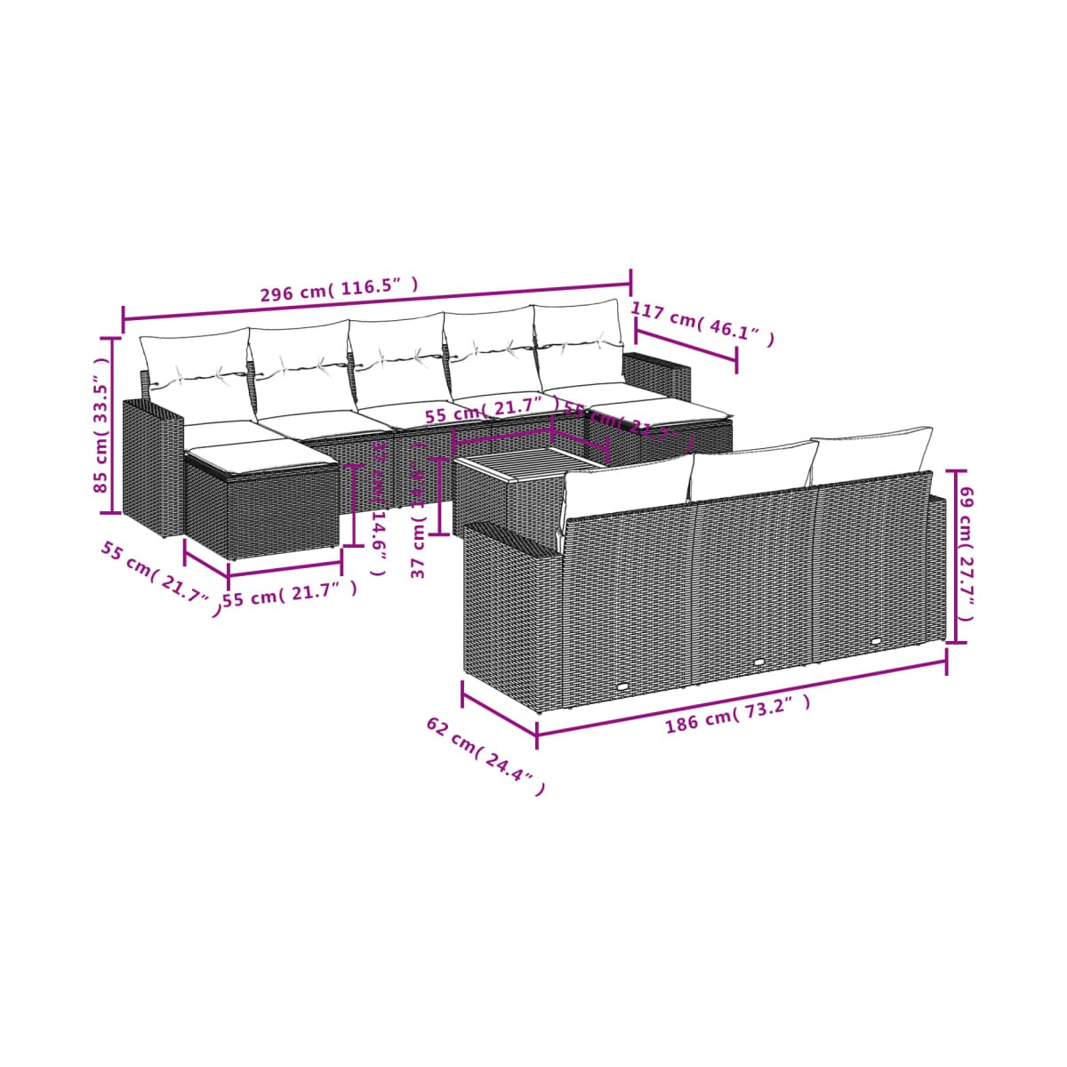 - Dimensiones del cojín de asiento: 55 x 55 x 3 cm (ancho x profundo x grosor)