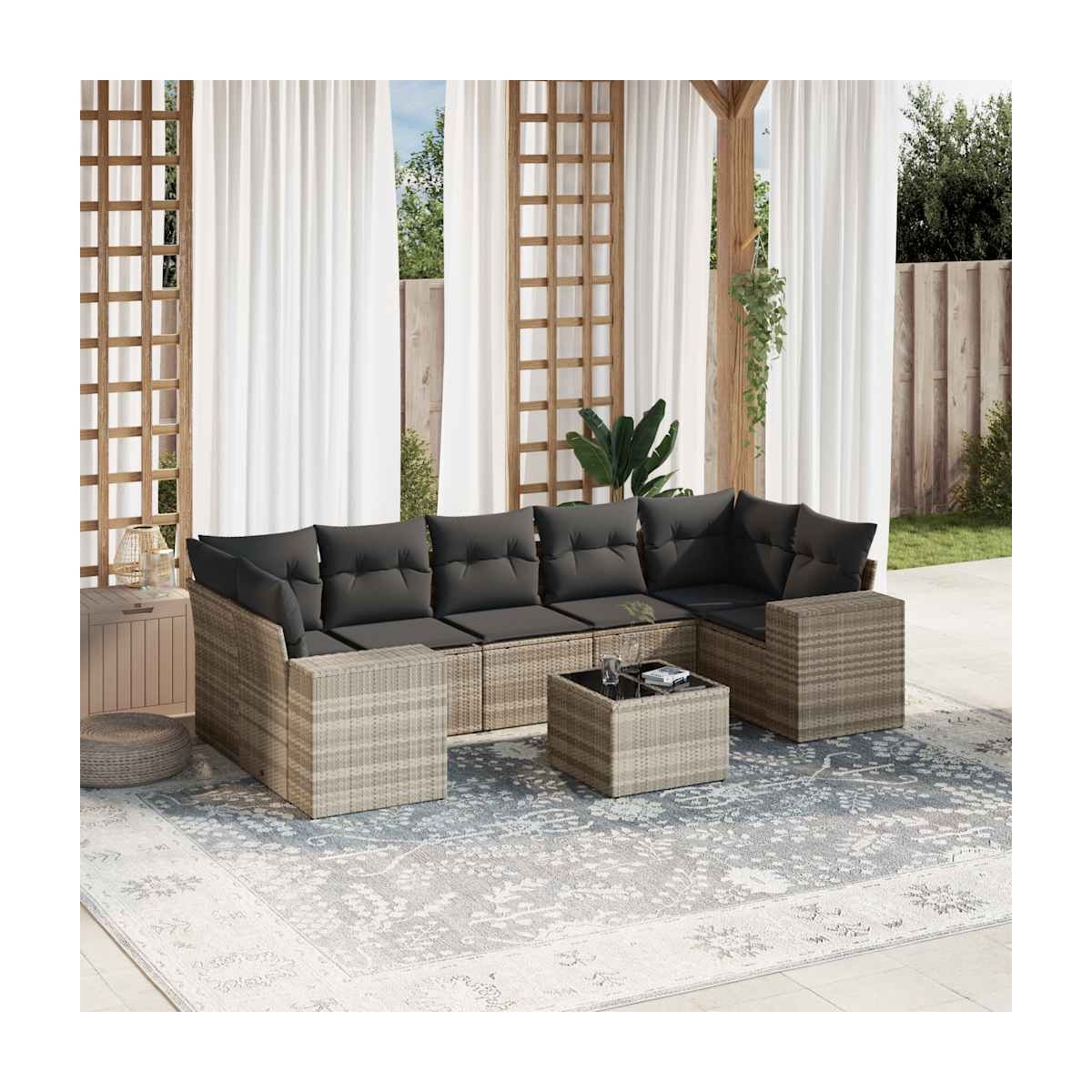 Este conjunto de sofás de jardín es el complemento perfecto para el jardín, terraza o patio, ya que proporciona un espacio confortable y acogedor para charlar con familiares y amigos o simplemente relajarte y disfrutar del aire libre. Material duradero: El ratán PE, también conocido como ratán sintético, es un material sintético resistente y de bajo mantenimiento que se parece al ratán natural. Es ligero, fácil de limpiar y se usa comúnmente para muebles de exterior debido a su durabilidad y propiedades resistentes a la intemperie.Superficie de vidrio: La superficie de la mesa de exterior es de vidrio templado resistente y duradero, por lo que es fácil de limpiar con un paño húmedo y añade un toque de elegancia a tu espacio exterior.Experiencia de asiento cómoda: Estos muebles de exterior, completos con cojines acolchados gruesos, ofrecen una experiencia de asiento cómoda.Funda desenfundable y lavable: Estos cojines de asiento cuentan con fundas desenfundables para facilitar el lavado y mantenimiento.Diseño modular: Este conjunto de muebles de exterior tiene un diseño modular, por lo que es completamente flexible y fácil de mover, para que puedas crear una disposición de muebles de exterior personalizada. Información útil:Para asegurarte de que tus muebles de exterior se mantengan hermosos, recomendamos protegerlos con una funda impermeable.