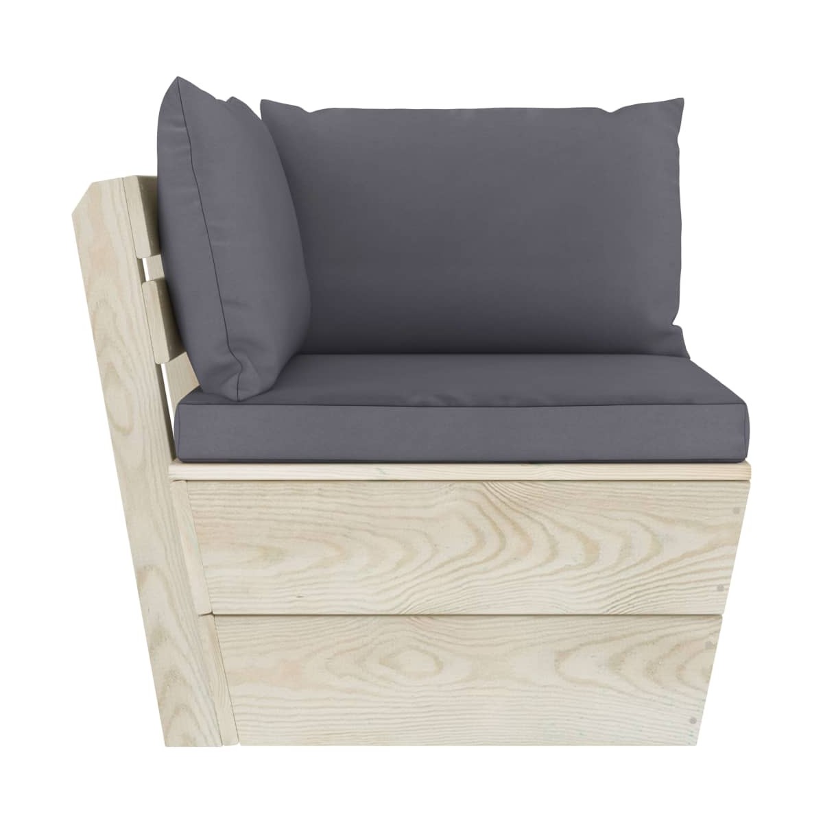Este moderno sofá esquinero de palets de jardín con cojines es una excelente opción para que te relajes y disfrutes del buen tiempo, eches una siesta o charles con tu familia o amigos. Con un diseño de palets atemporal, este sofá de madera agrega un toque de encanto rústico a tu patio, jardín o salón. El sofá de jardín está hecho de madera de abeto impregnada, lo que lo hace duradero y estable. Este sofá de esquina tiene una construcción maciza y requiere poco mantenimiento. Gracias a la tapicería 100% poliéster y al grueso acolchado, los cojines del palé son suaves y proporcionan el máximo confort. Es ideal para noches de cine en familia, jugar a videojuegos y disfrutar del buen tiempo en el porche. Este asiento de patio también presenta un diseño modular, lo que lo hace completamente flexible y fácil de mover para adaptarse a cualquier entorno. ¡Puedes combinarlo con otros segmentos modulares para crear tu propio ambiente de salón de jardín según tu gusto! Ten en cuenta que la madera es un producto natural y puede presentar ligeras imperfecciones.