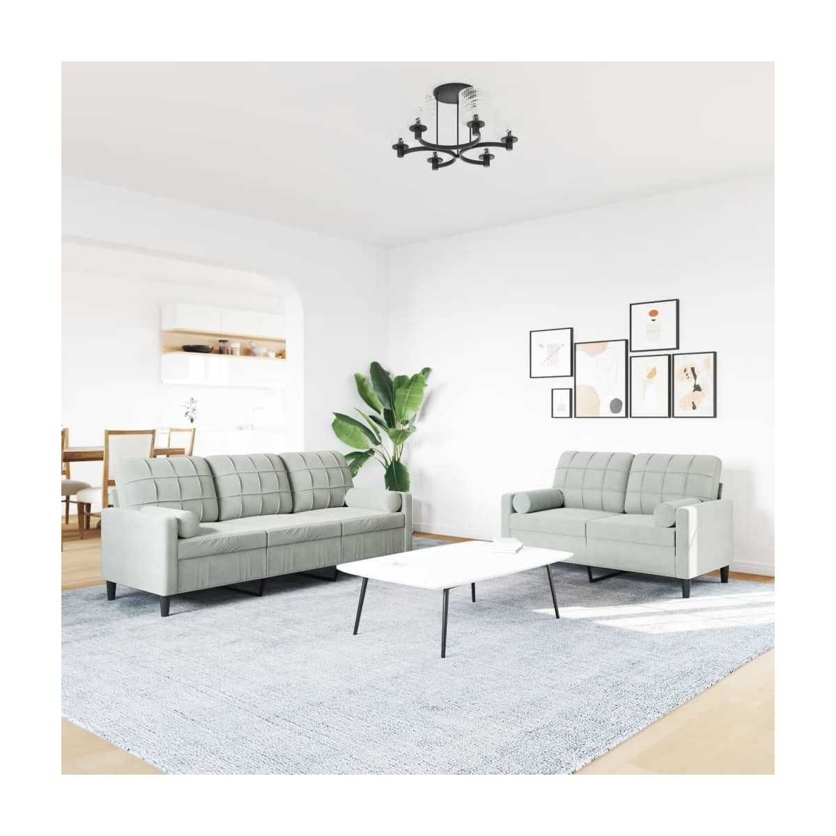 Este juego de sofás es un lugar excelente para charlar, leer, ver la televisión o simplemente relajarse. Está pensado para ser el centro de atención de la casa. Material suave y cómodo: La tela de terciopelo ofrece una superficie suave y lisa que proporciona una agradable sensación contra el tacto, aportándole calidez y el máximo confort.Estructura robusta y estable: La estructura de metal del sofá garantiza la robustez y la estabilidad.Cómoda experiencia de asiento: El sofá es muy cómodo con los asientos, reposabrazos y cojines traseros con acolchado grueso.Diseño llamativo: Con un diseño sencillo pero moderno, este sillón está pensado para llamar la atención en tu habitación.