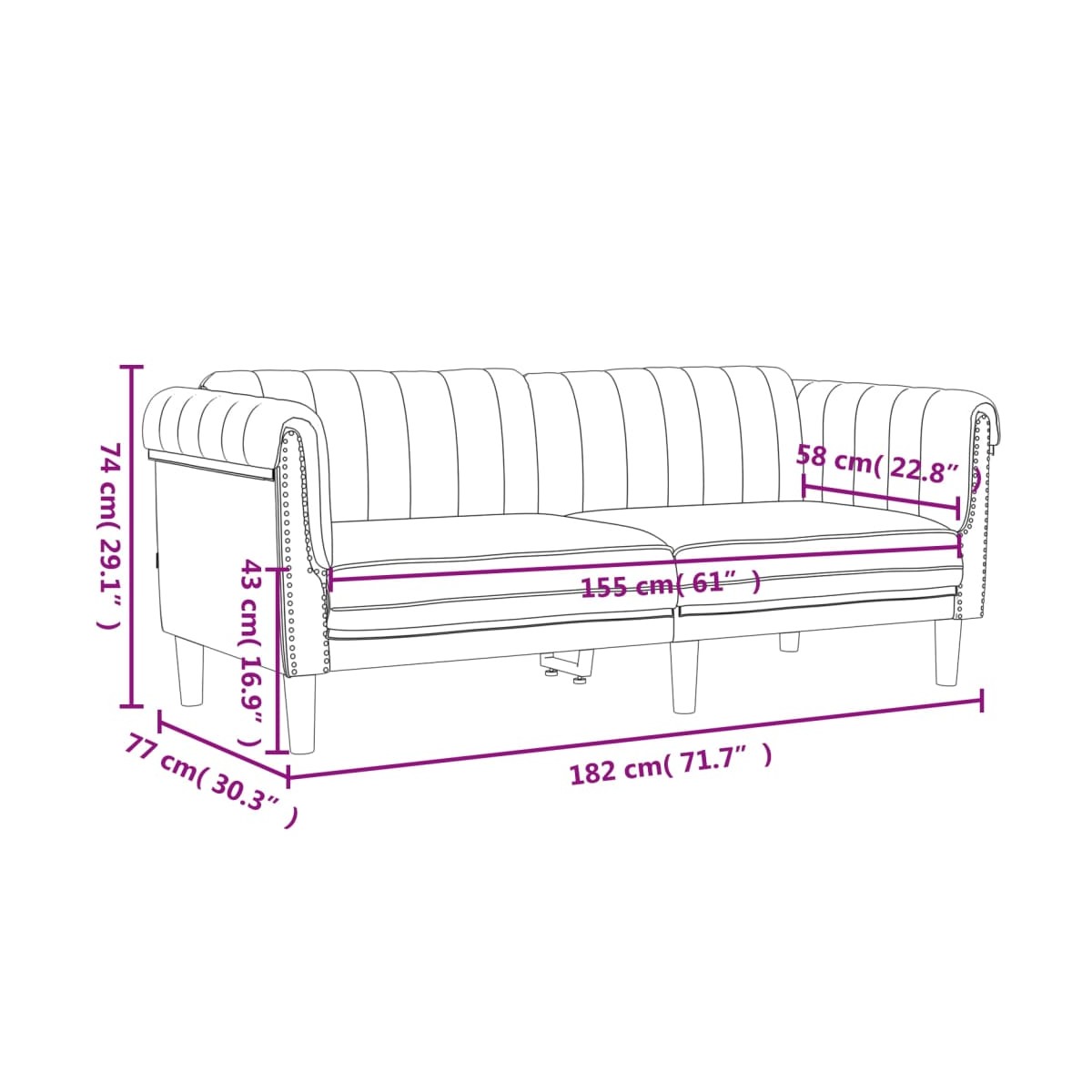 - Dimensiones totales: 182 x 77 x 74 cm (ancho x profundo x alto)