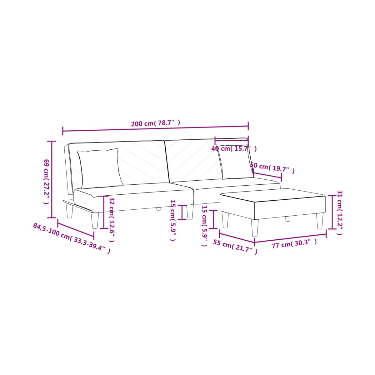 - Dimensiones totales: 200 x 84,5 x 69 cm (ancho x profundo x alto)