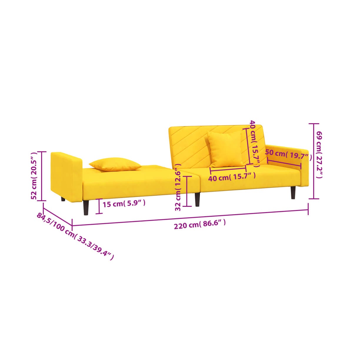 - Dimensiones totales: 220 x 84,5 x 69 cm (largo x ancho x alto)